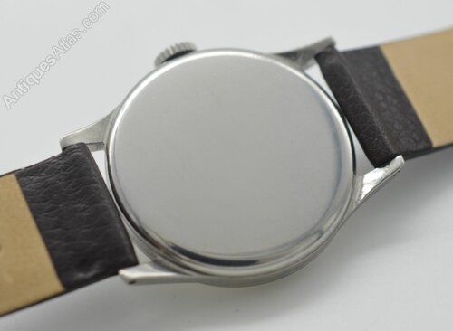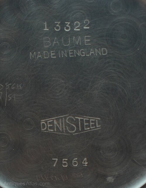 A stainless steel 3 piece case with a snap on case back. Case back inner marked 'Baume, Made in England' and 'Denisteel'. Baume were the official importers for Longines in Great Britain and primarily used Dennison for their cases - as one of the premier case makers of the period. Case back signed 13322 and 7564.