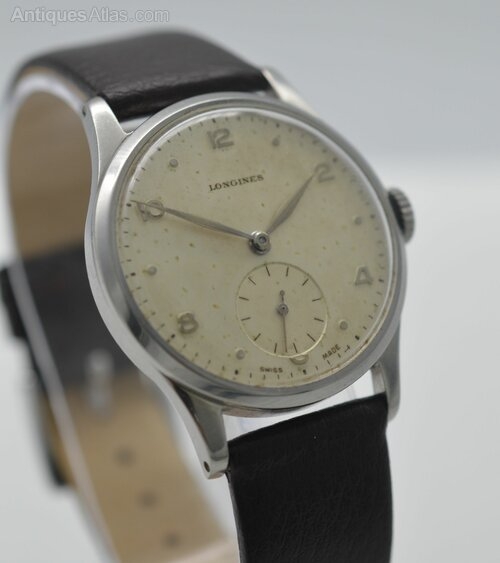 A 1951 Longines stainless steel cased wristwatch. A silvered dial with light patina. Applied steel Arabic numerals to the even numbers, with contrasting applied dots to the rest. Surrounded by an outer minute track. Steel 'feuille' hands. A subsidiary seconds dial to 6 o'clock, above 'Swiss made'.