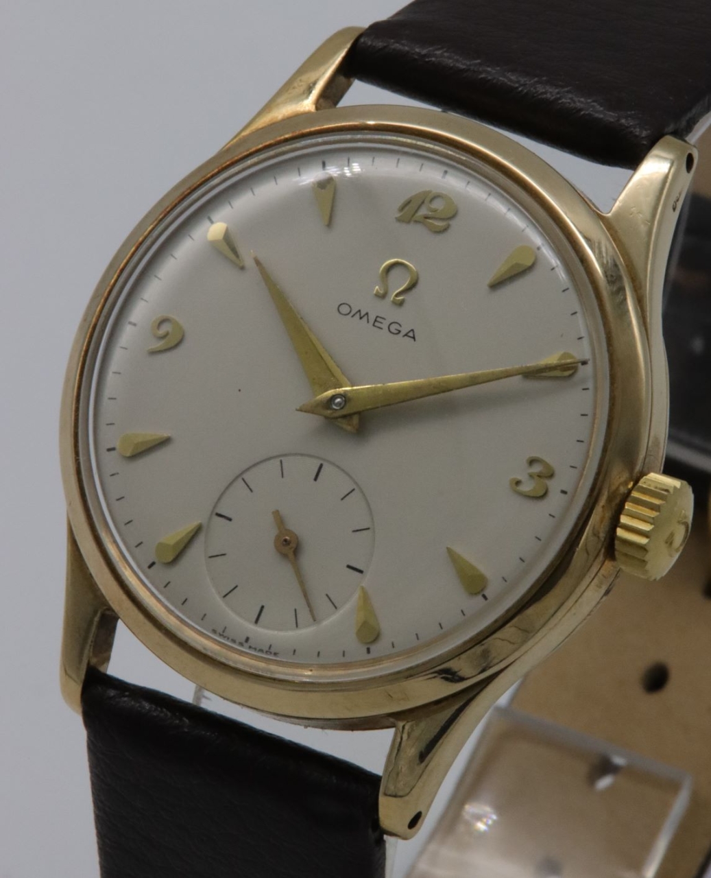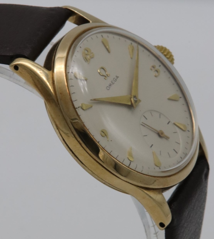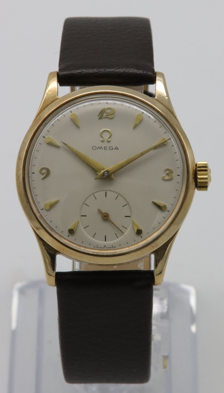 A 1952 Omega 9K gold wristwatch. A silvered dial, with applied gilt hour markers of an arrowhead style. The quarters are indicated by applied 'Breguet' style numerals. Signed Omega, below a gilt logo to 12 o'clock. A recessed subsidiary seconds dial to 6 o'clock. The hours and minutes are indicated by gilt 'dauphine' hands. Signed Swiss Made.