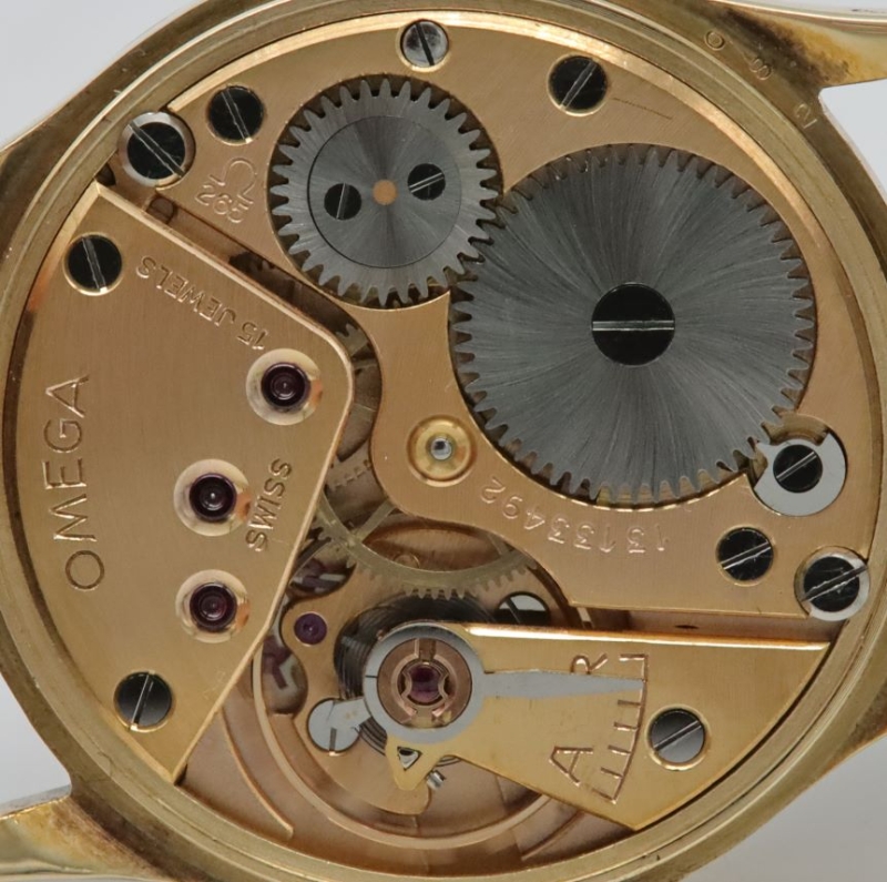 The watch is powered by a 17 jewel, manual wind Omega caliber 265 mechanism. Serial numbers date this watch to 1952.