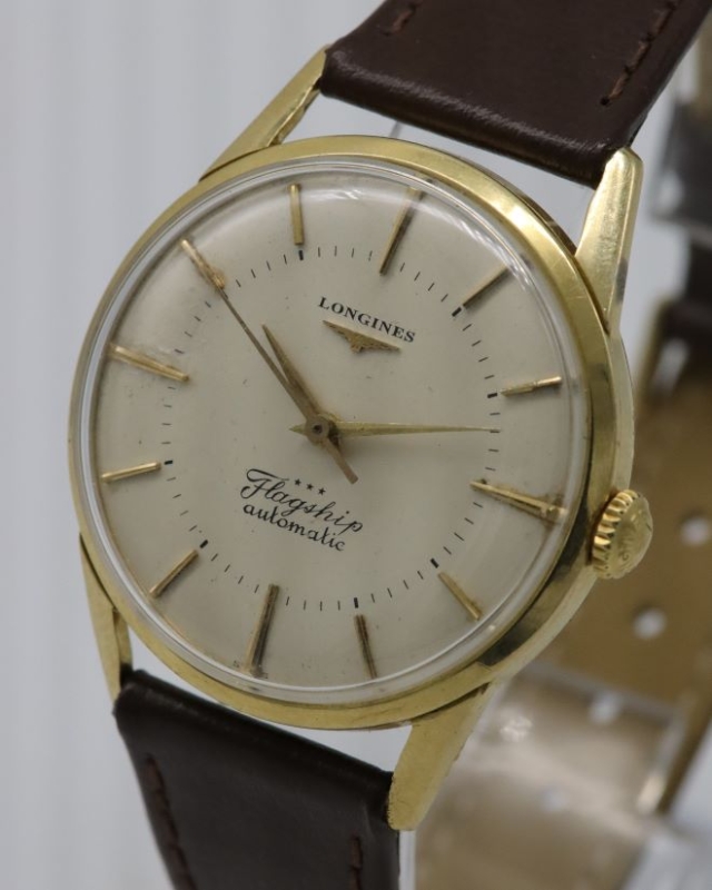 A 1959 Longines Flagship 'Big Ship' 18K gold wristwatch. A matte white dial with elongated hour markers, slightly larger at the quarters. An inner printed minute track with segmented 5 minute markers. An applied gilt Longines winged hourglass logo below 12, with printed script above. Signed to the lower section ''Flagship Automatic' with 3 stars.