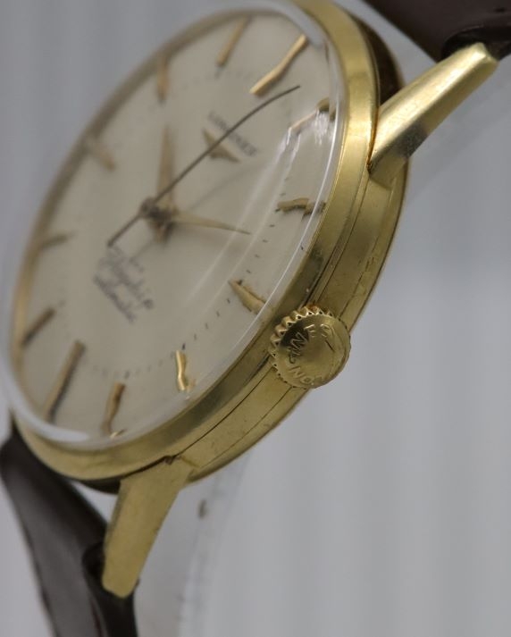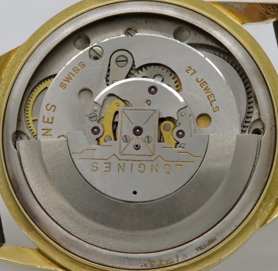 The watch is powered by a very rare, 27 jewel caliber 380 Longines mechanism. A slim rotor decorated with the Longines logo. Serial numbers date this watch to 1959.