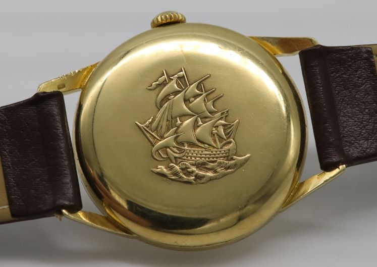 A solid 18K gold case, with elegantly tapered lugs showing champfered edges. The case overall is particularly well proportioned with a slim bezel and a flat case back. The standout feature of this watch is the case back, with a raised 'big ship' depicted - showing minimal signs of wear to the decoration. Original Longines winding crown. Signed to the inner 'Longines, Fab Suisse, Flagship' as well as a Swiss poincon 108. Case reference 1403.