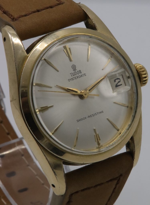 A 1965 Tudor Oysterdate wristwatch. A silvered dial with a sunburst effect. Elongated slim hour markers, with arrowed accents to the quarters. Signed below 12 o'clock with the Tudor Rose logo and with model script 'Oysterdate'. A date aperture to 3 o'clock, viewed through a cyclops lens. Signed Swiss Made to 6 o'clock.
