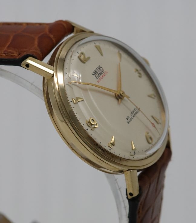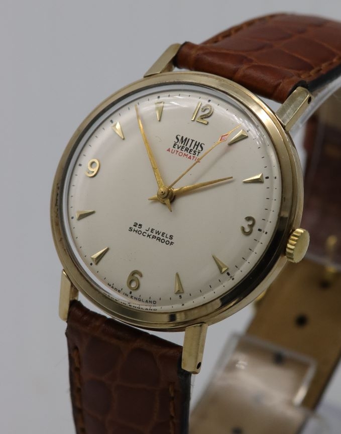 A 1966 Smiths Everest Automatic 9K gold wristwatch, full set. A remarkable find, this watch comes complete with its original inner and outer box, paperwork and is even accompanied by what is likely its original leather strap. A matte white dial with faceted 'arrowhead' hour markers and Arabic numerals to the quarters. Signed to the dial 'Smiths Everest Automatic' and 'made in England' to 6 o'clock. The hours and minutes are indicated by gilt hands, along with the classic Smiths signature of a red tipped seconds hand.