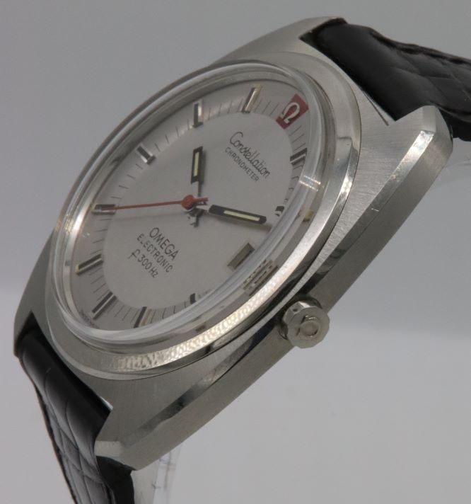 A 1972 Omega Constellation Chronometer f300hz. A two tone dial with a high shine silvered centre and a matte outer ring. Applied steel hour markers, each backed by lume caps. Elongated printed minute markers and script for 'Constellation Chronometer' and model script to the bottom half of the dial. The 12 numeral is shown as the red backed Omega logo, used for the electronic models of this period. A date aperture to 3 o'clock. Original Omega perspex crystal.