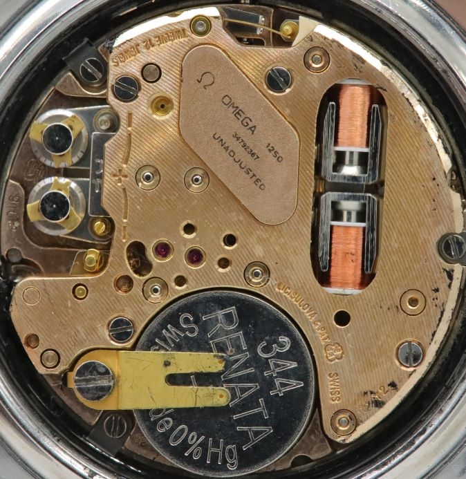 The watch is powered by a 12 jewel caliber 1250 Omega Electronic mechanism. Serial numbers date the production year for this watch to 1972. This watch comes complete with its original inner and outer box, paperwork, international guarantee and Omega strap.