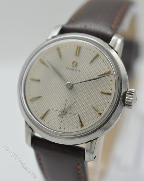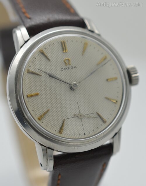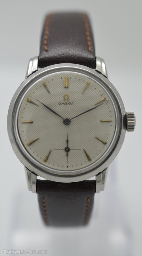 A 1941 Omega wristwatch, in stainless steel. This rare example features a 'honeycomb' dial—a textured effect that is seldom seen on these models. The hour markers are slim, applied dagger-style indices. A subsidiary seconds dial at 6 o'clock is marked with a fine crosshair as opposed to the circular versions - giving extra balance to the dial. Surrounding the main dial is a printed outer minute track The hours and minutes are indicated by shaped 'leaf' hands. Below 12 o'clock the gilt Omega logo is applied, above the printed 'Omega' script in black print.