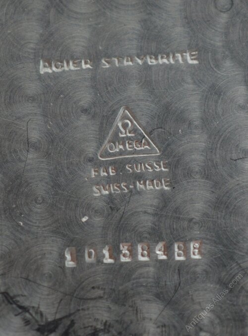 A well crafted three-piece stainless steel case, with a snap on back. The case back inner is marked with the inscription 'Acier Staybrite', with the Omega logo engraved in the centre. This particular example is exceptionally rare, distinguished by its unique 'stepped' lugs - reminiscent of the Art Deco era. Complete with an Omega winding crown.