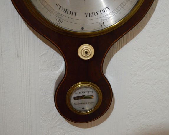 A William IV period mercury wheel barometer. A slim mahogany case of good proportions with a swan neck top pediment and central brass finial. Choice flame mahogany veneers and case edge banding. Silvered dials to the hygrometer, thermometer and level. A well engraved main dial. Signed to the level 'A BONETTI, SCARBOROUGH'.. Circa 1835.