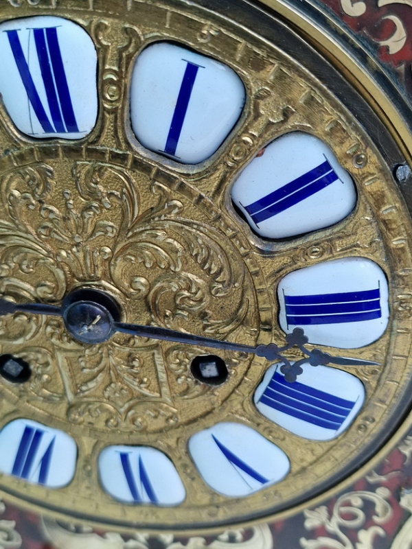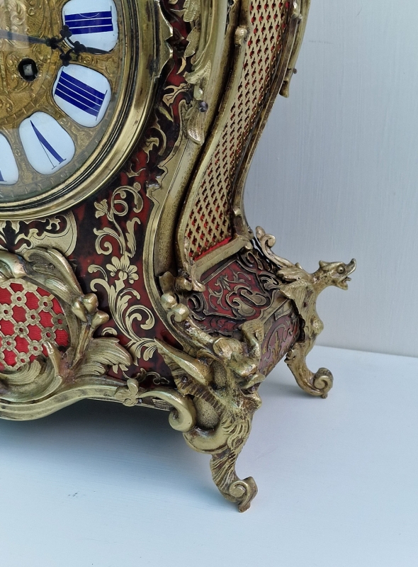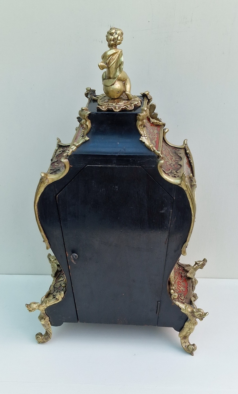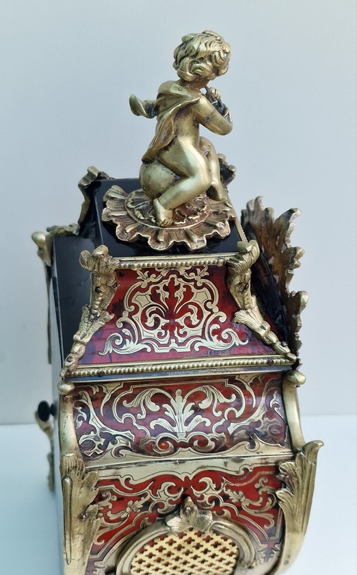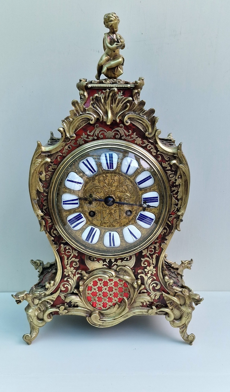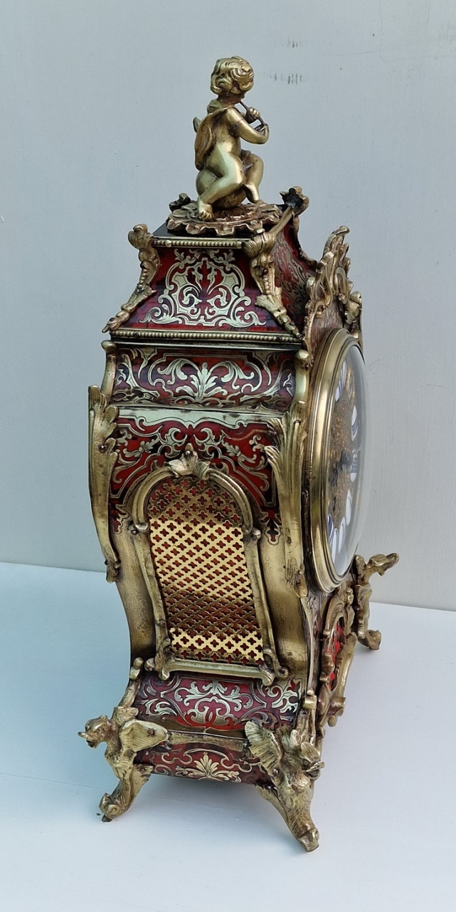 A fine quality and impressive French boulle tortoishell mantel clock. Red ground with brass boulle inlay. A front fretted panel and to the sides with red backing. Rococo gilt bronze case mounts and surmounted by a cherub. A raised gilt dial with individual enamel numeral cartouches and blued steel hands.