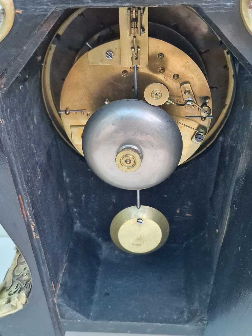An 8-day duration mechanism striking the 1/2 hours and hours on a bell engraved by makers 'Vincenti'. Numbered pendulum and mechanism. Circa 1880.