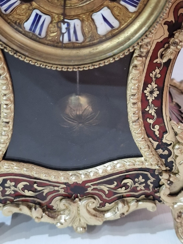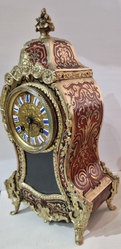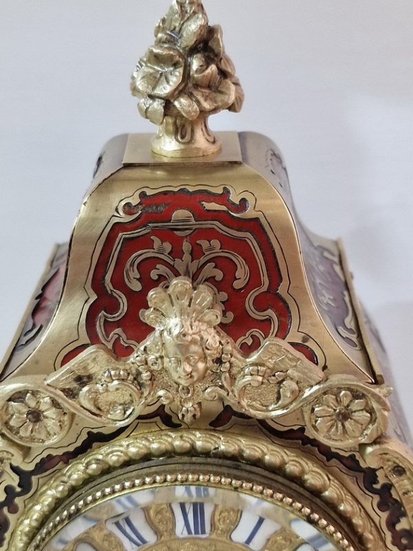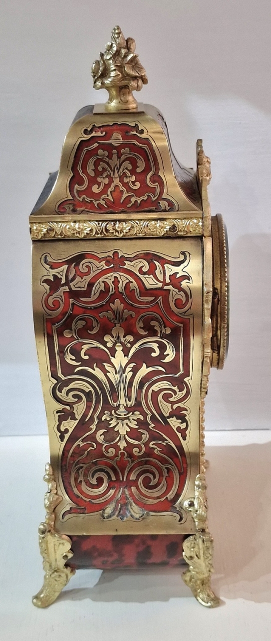 An impressive inlaid mantel clock by Japay Freres of Paris. A smaller proportioned brass and red tortoiseshell boulle case. Inlaid front and sides to the case. Gilt case mounts in the rococo style. A gilt dial with individual enamel cartouche Roman numerals. Ornate blued steel hands. A well cast gilt dial bezel surround and bevelled glass. A glass front panel showing the original decorative gilt pendulum. An 8-day duration mechanism striking the 1/2 hours and hours on a bell signed Japay Freres. Circa 1880.