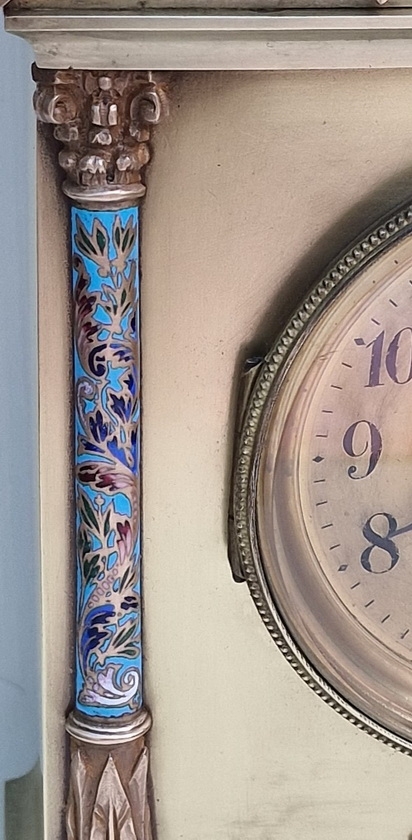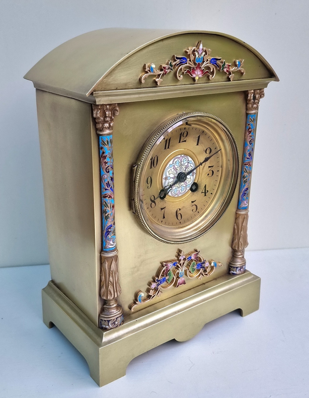 A French brass and gilded mantel clock. An arched pediment with a raised champleve panel. A gilded dial with blued steel hands and an enamel dial centre. Corinthian side columns with enamel decorations.