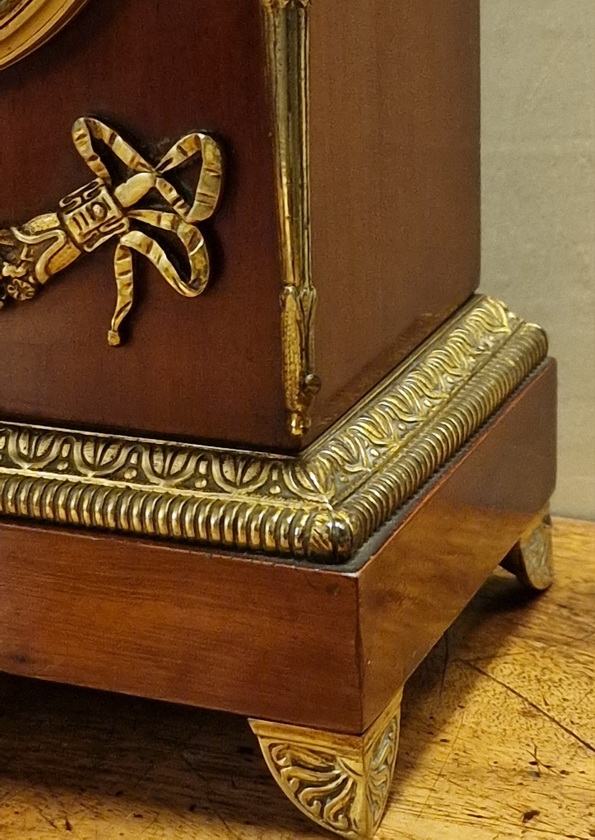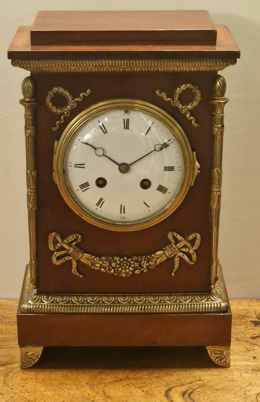 A quality French mantel clock in the Empire period style. A walnut case with gilded case mounts. Swags to the case front and tapered torches to the sides standing on decorative feet. An enamel dial with 'moon' blued steel hands and convex glass.
