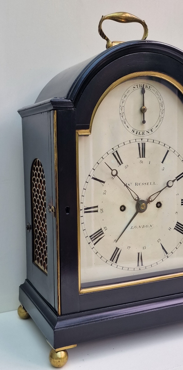 A Georgian twin fusee bracket/table clock. An elegant, ebonised arched top case of good proportions. The case front has brass edging to the dial and standing on brass ball feet. Brass fretwork to the case sides with silk backing. An arched painted dial signed 'HY. RUSSELL LONDON' with a strike/silent in the arch. A rarer feature of a third hand for the days of the month shown on the inner section from 1 to 31. A fine quality, twin fusee mechanism striking the hours on a bell. A beautifully engraved backplate to the mechanism signed Russell London within a cartouche. A pull repeat to the side. A glass back door showing the mechanism. The original pendulum transportation lock and a finer quality pendulum with accurate adjustments on the scale. Circa 1815.