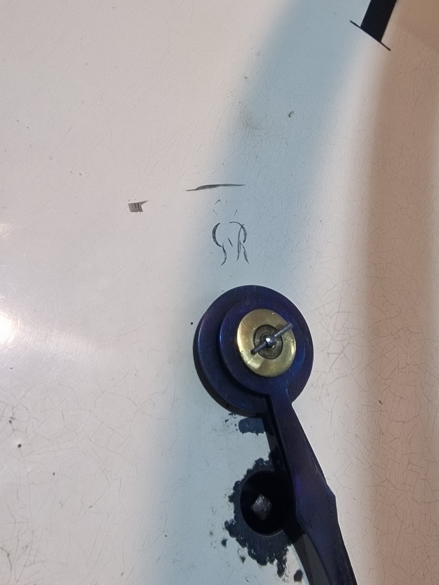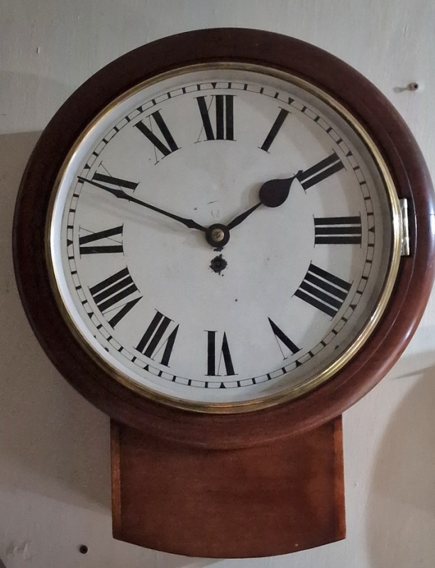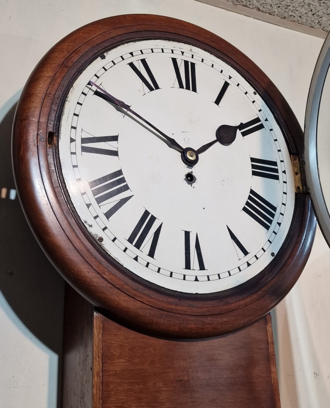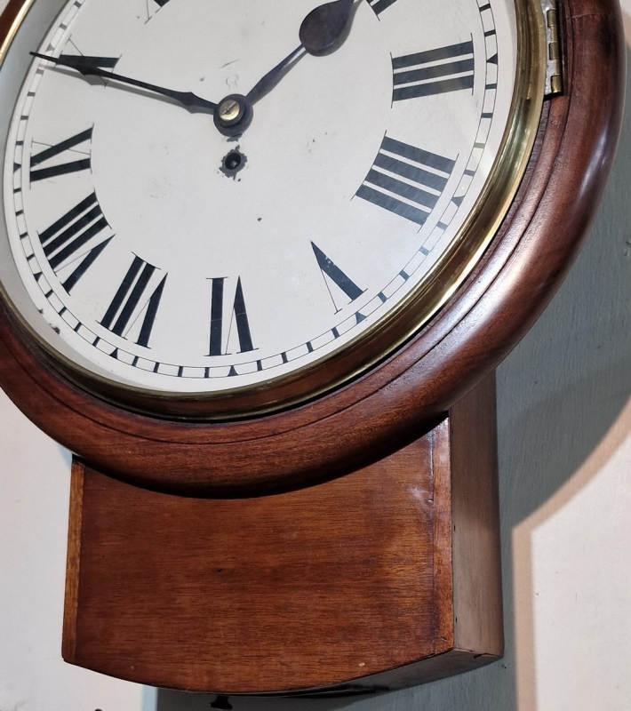 A larger 14" painted dial fusee wall clock. The dial is signed 'GvR' for King George 5th. Blued steel hands. A drop dial mahogany case with a brass bezel surround. An 8-day duration fusee timepiece mechanism. Circa 1910.
