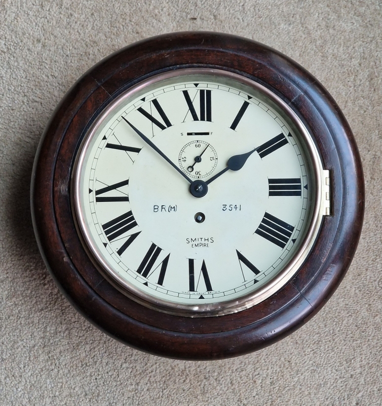 Smiths supplied the railways with 'station' clocks. This example is from British Railways Midlands region. There are indistinct 24 hour markers on the inside edge of the dial as often seen on railway use examples.