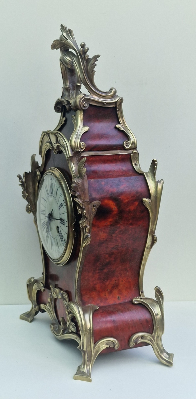 An impressive French tortoishell mantel clock. Very well cast gilt mounts of rococo design. An enamel dial with raised Roman numeral edging and 5 minute outer markers with blued steel hands. An 8-day duration mechanism striking the hours and half hours on a gong by Marti of Paris. Circa 1910.