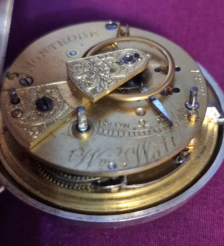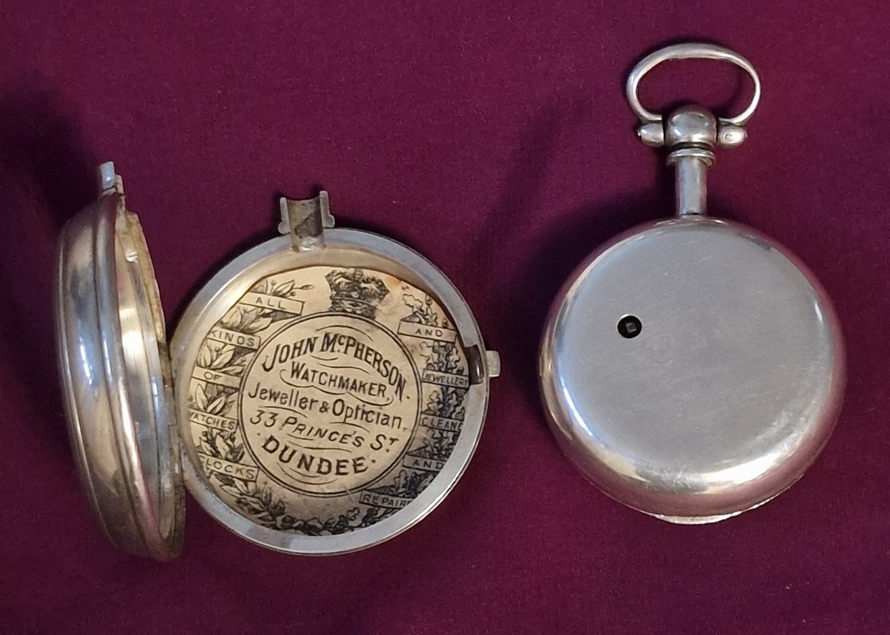 A good quality Scottish pair cased silver pocket watch. An enamel dial with gilt hands and subsidiary seconds dial. A fusee mechanism with engraved decorations signed 'Wm Watts, Montrose'. A case back paper 'John McPherson Dundee'. Chester hallmarks for 1901. A key wind mechanism.