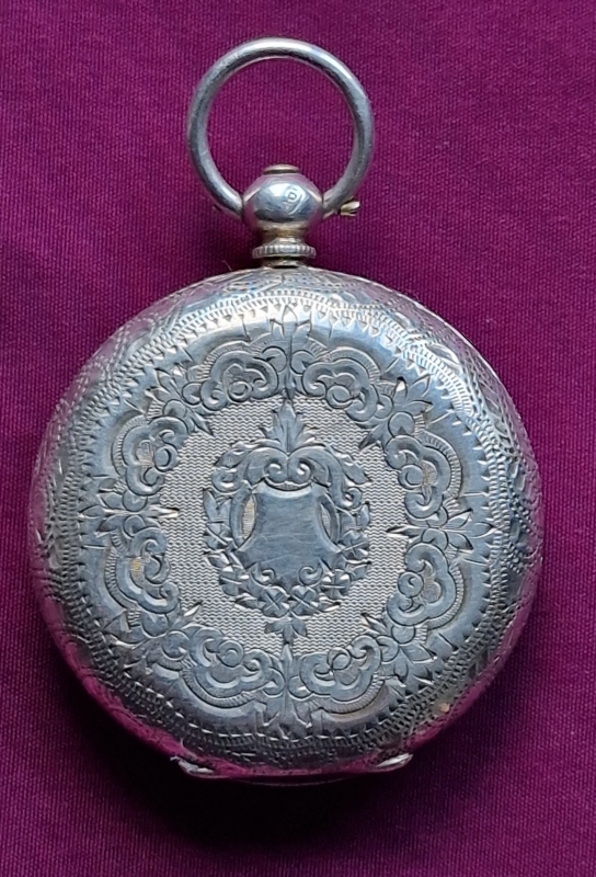 A Swiss silver pocket watch. An enamel dial with blued steel hands. Engraving to the case back and sides. A key wind mechanism. Birmingham hallmarks for 1882.