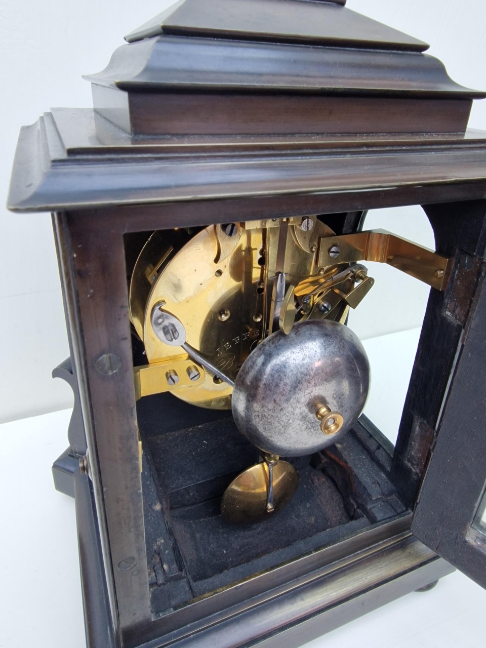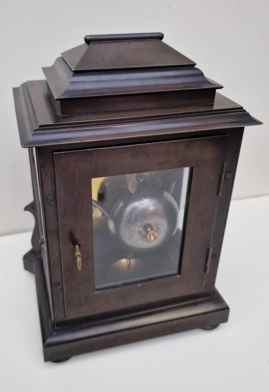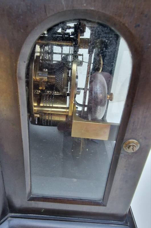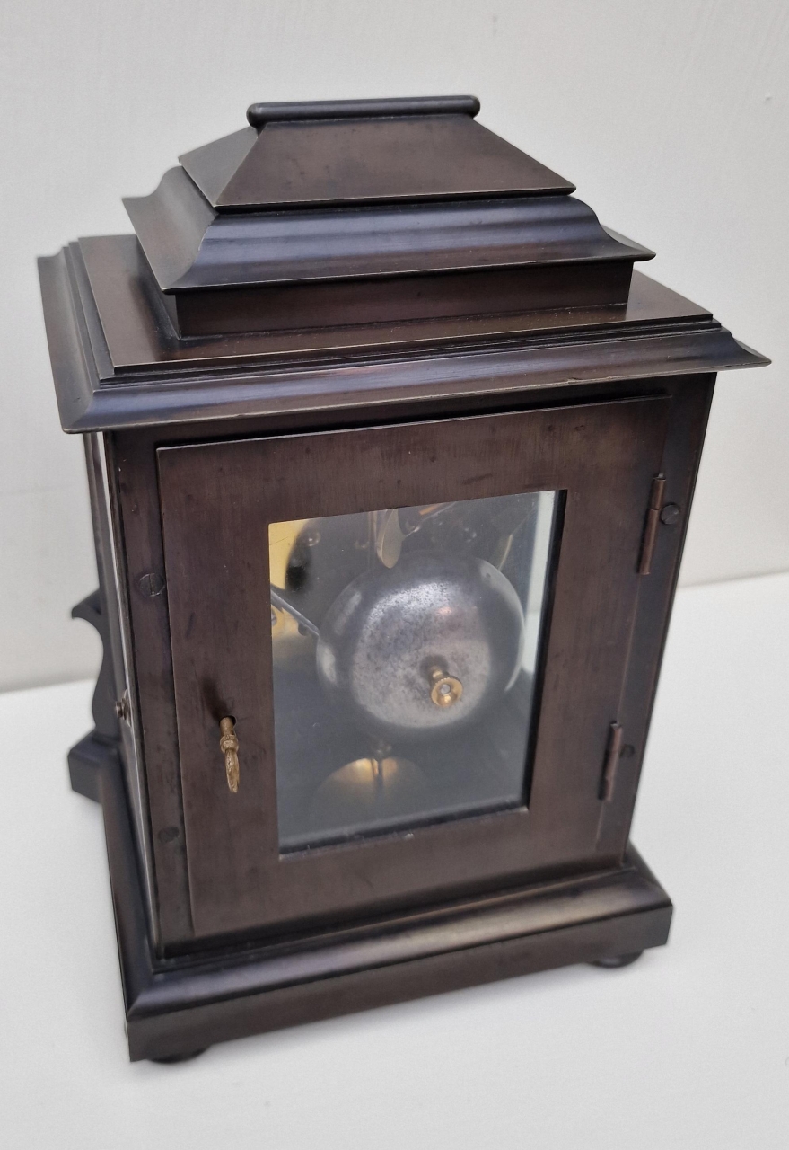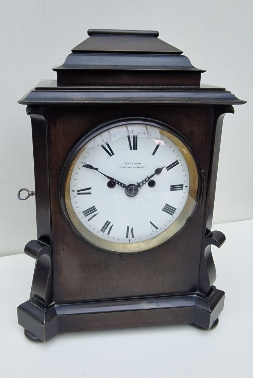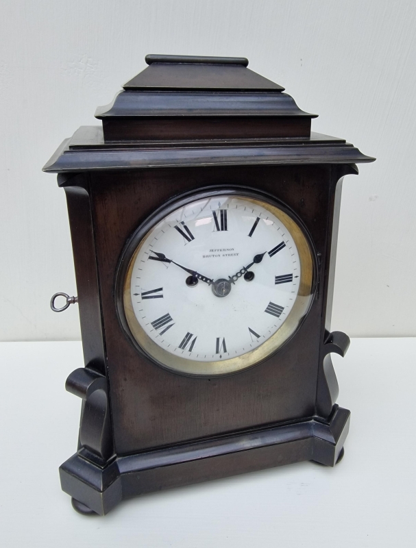 A rare, small double fusee mantel clock. A bronze patinated case with a stepped pediment and scrolled chamfered sides. Arched side glass apertures. A glass back door showing the mechanism. An 8-day duration, twin fusee mechanism striking the 1/2 hours and hours on a bell engraved 'Jefferson Bruton Street'. A pendulum transportation lock. An enamel dial with fine blued steel hands also signed 'Jefferson Bruton Street'. A locking front bezel and rear door.