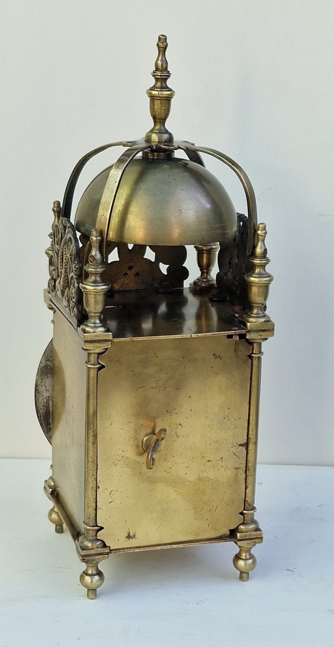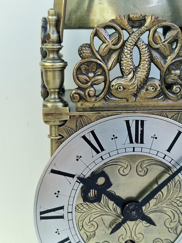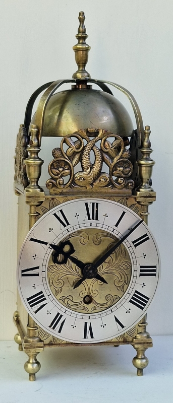 A nice quality, small English lantern clock. A brass case with engraving to the centre with blued steel hands. Engraved top fretwork panels and the dial surround. A carriage clock type mechanism with a platform escapement of 8-day duration. Passing hourly strike to the bell. Signed 'Canham of London' to the mechanism. Circa 1950.