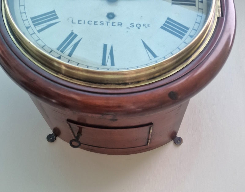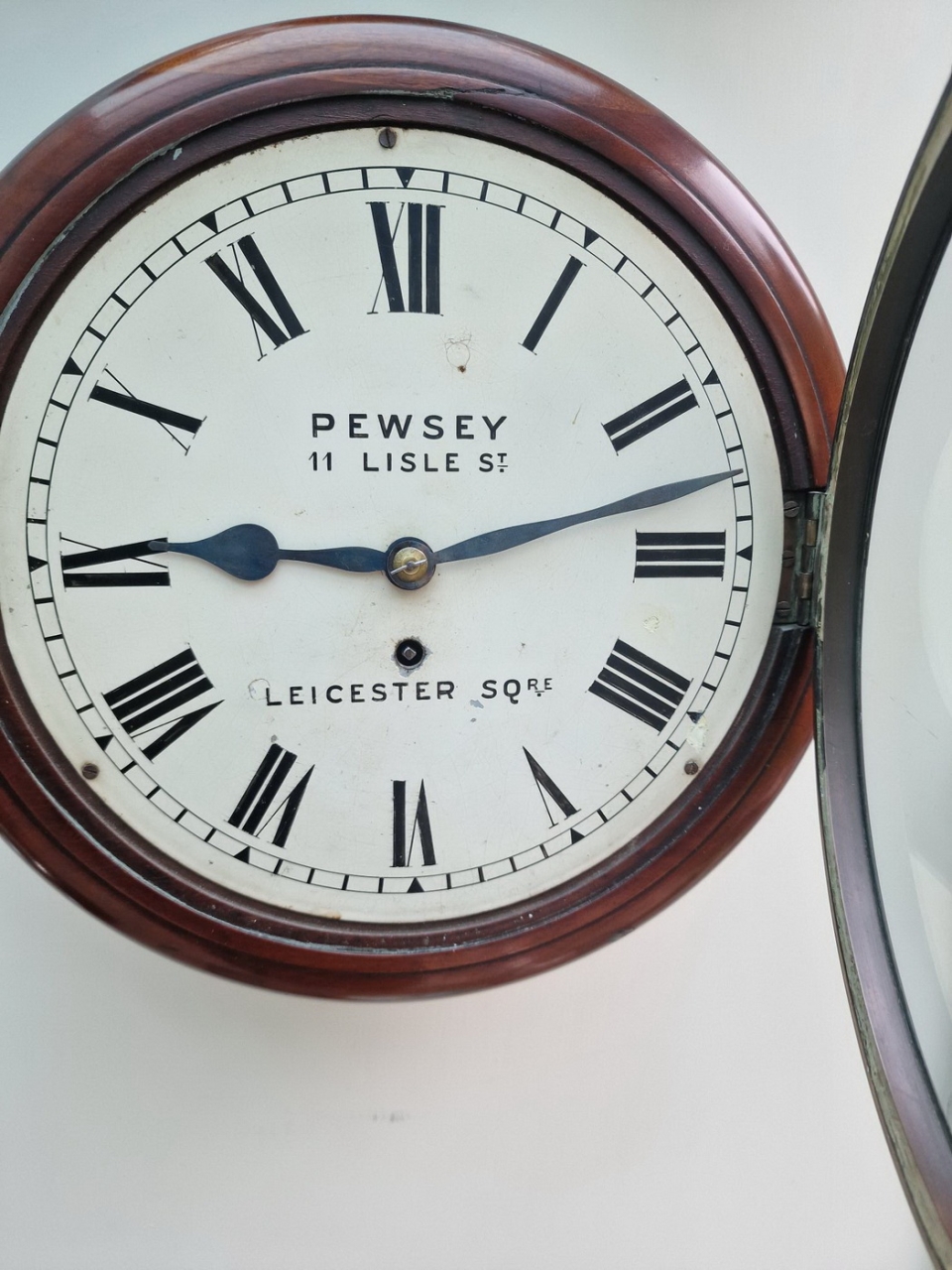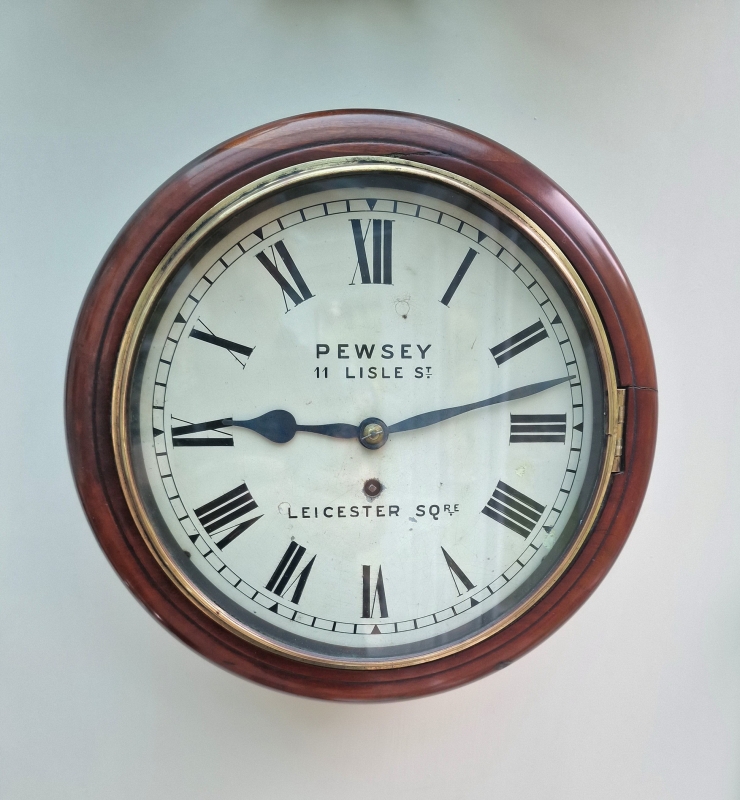 A Victorian fusee dial wall clock. A rarer, 10" painted dial signed 'PEWSEY, 11 LISLE ST LEICESTER SQ. (London)' with blued steel hands. A mahogany case of smaller proportions with a brass bezel surround. An 8-day duration fusee timepiece mechanism. Circa 1860.