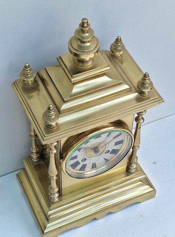 A good quality Victorian French mantel clock. A brass case with a stepped pediment surmounted by finials. Turned side columns and a stepped base plinth. A silvered dial with a gilt centre and gilt brass hands. A glass back door.