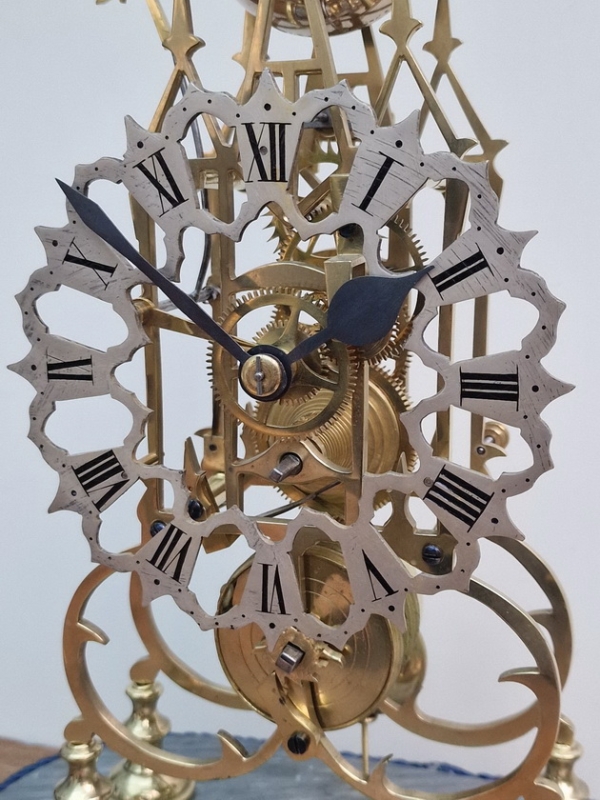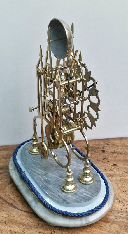 An impressive and high quality English Victorian skeleton clock. An original glass dome to the stepped blue and white marble base standing on feet. A silvered fretted dial with Roman numerals. Blued steel hands. An 8-day duration fusee mechanism with passing strike on a bell. Circa 1870