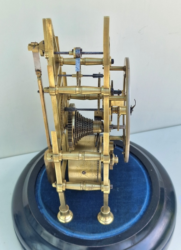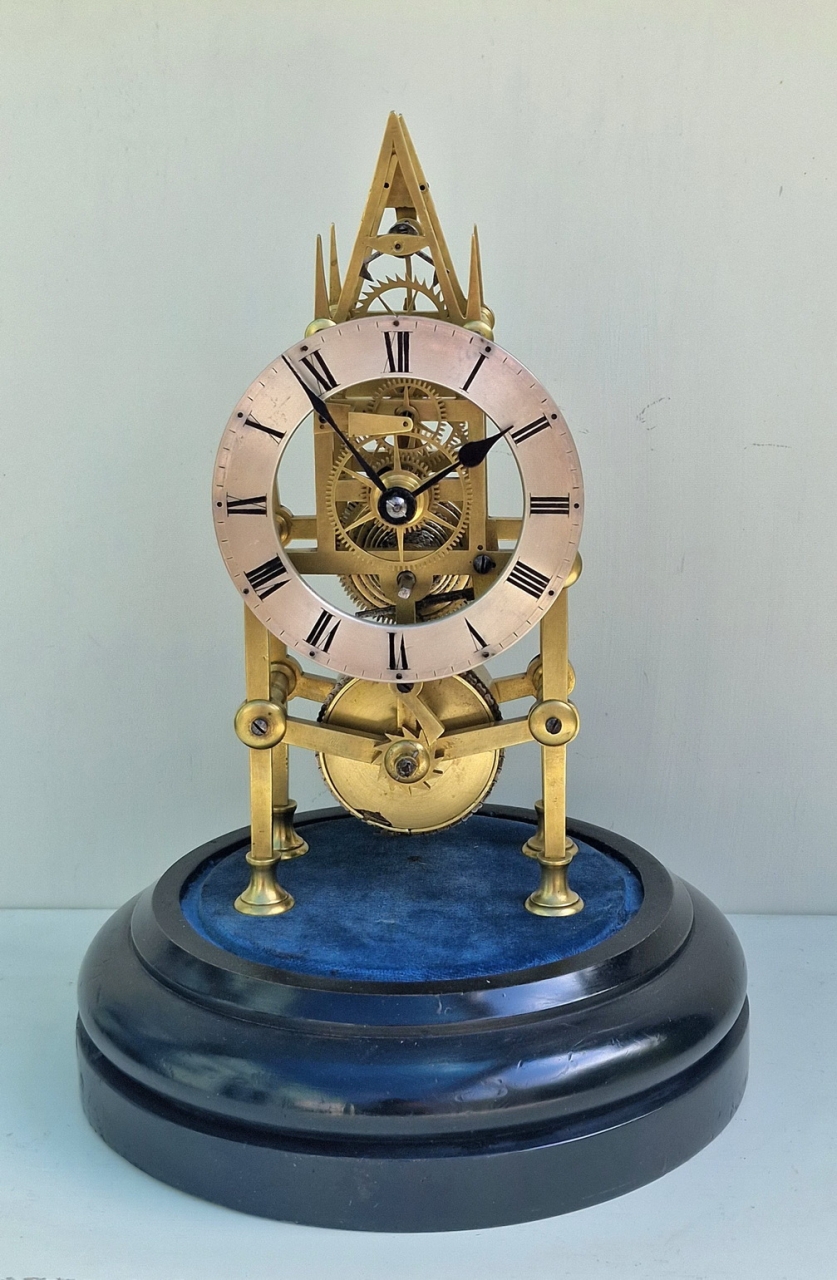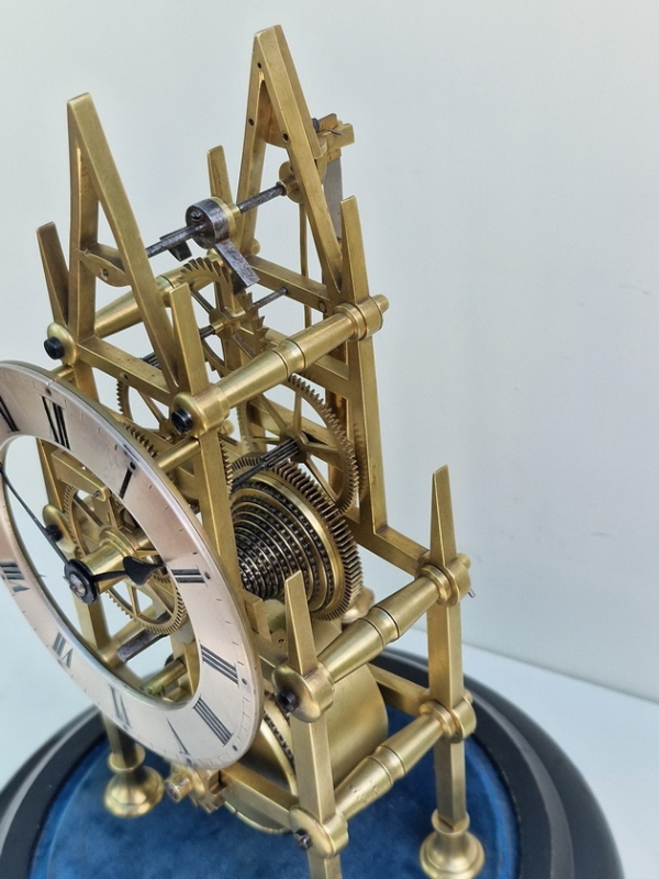 A good quality English Victorian period skeleton clock. An original glass dome to the stepped, ebonised and blue silk base. A silvered dial with Roman numerals. Blued steel hands.