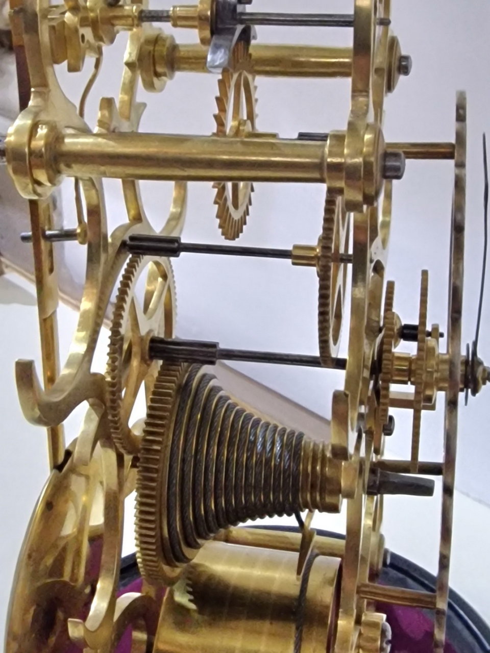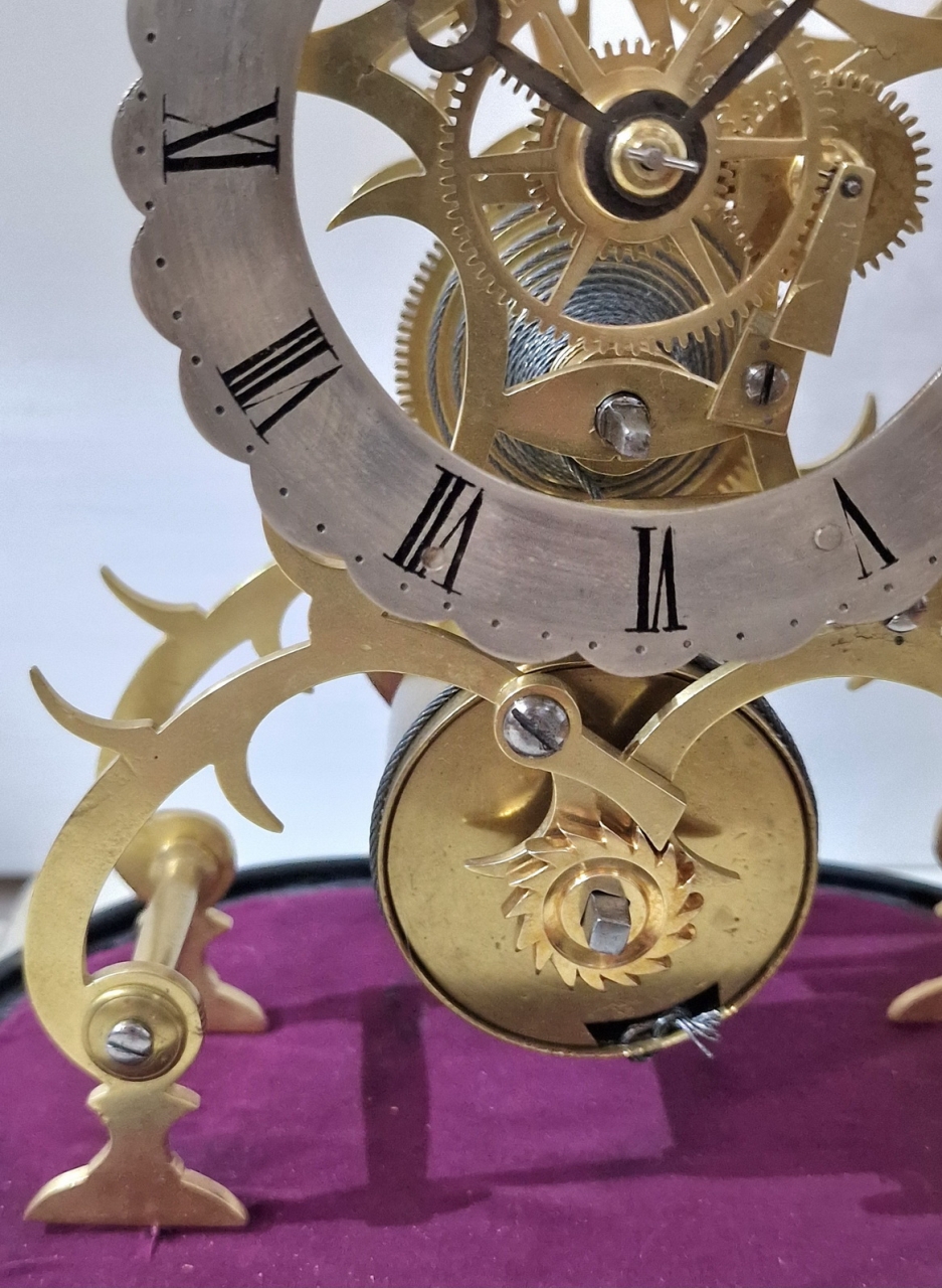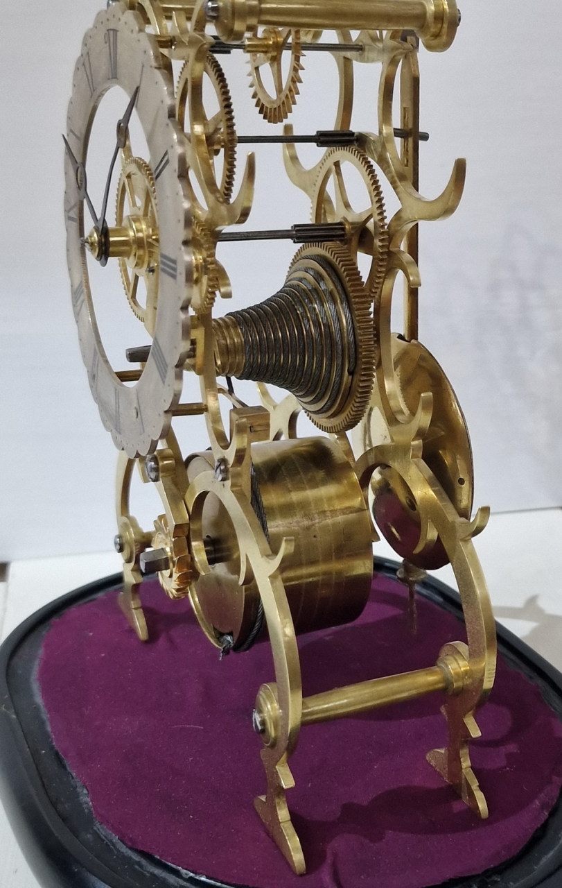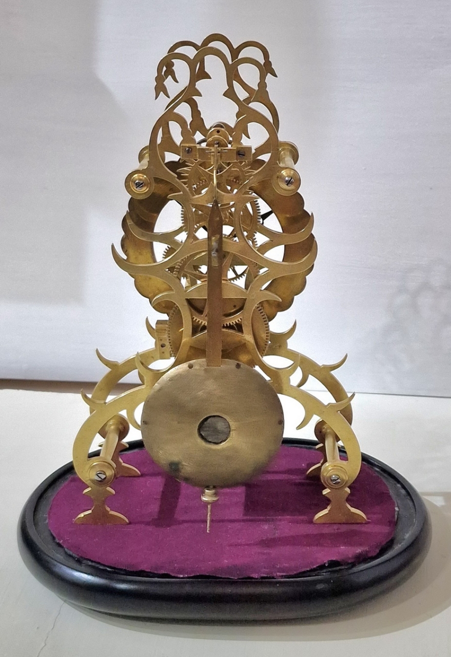 A good quality Victorian skeleton clock. A Victorian glass dome to the ebonised base standing on shaped feet. A brass frame with lovely fretted detailing. A silvered dial with Roman numerals and 'moon' blued steel hands. An 8-day duration fusee mechanism. Circa 1875.