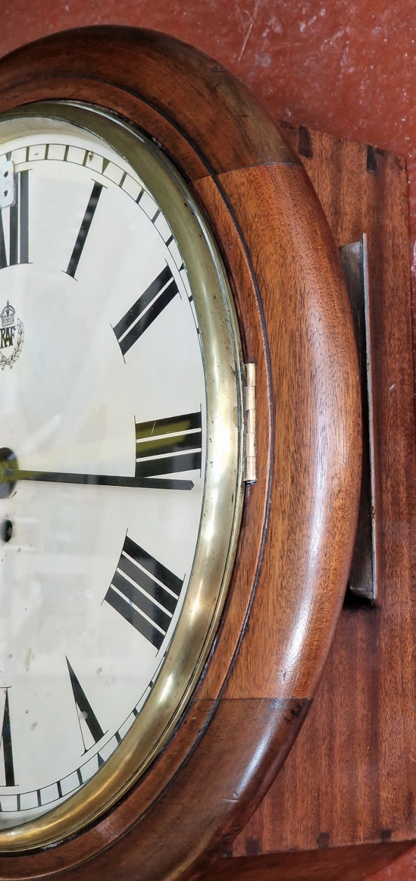 A historical WW2 period RAF wall clock. A mahogany case with a cast brass bezel and bevelled glass. A 14" original dial with the RAF laurel emblem and blued steel hands. The original case bottom lock and key.