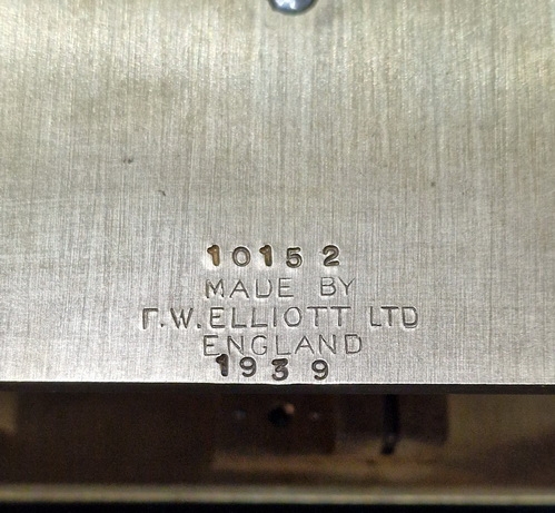 The 8-day, precision fusee mechanism is marked F.W Elliott Ltd. England. It is numbered 6244 and marked for the year 1939. F.W. Elliott Ltd, based in Croydon, London, played a significant role in the British war effort during World War II, producing specialized clocks for the military, particularly the Royal Air Force along with aircraft parts.