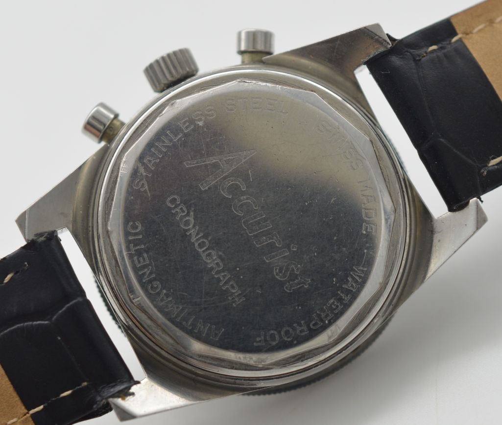 An oversized stainless steel one piece case. The main case body is made of one piece of stainless steel, giving a classic utilitarian look. Rotating Bakelite bezel with gilt and lume internals. Original crown and pushers. A screw down case back marked 'Accurist'.