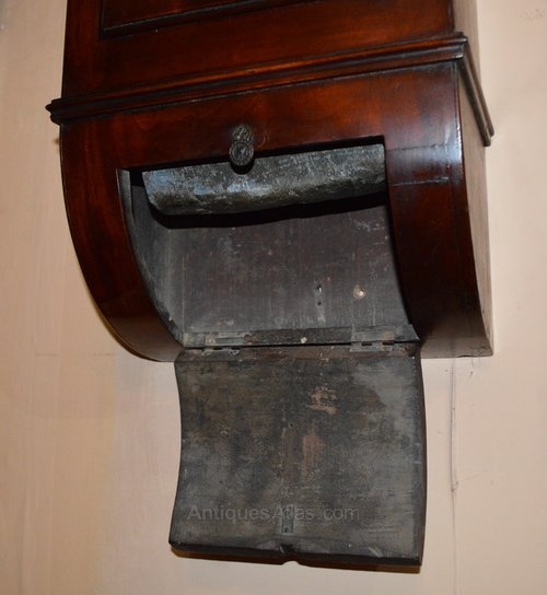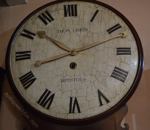 An English Tavern wall clock. A 22" wooden dial with brass counterbalanced hands. A well proportioned mahogany case with the original side carvings. An opening trunk door and base with twin side doors behind the dial. An 8-day duration mechanism, single weight driven. The original pendulum and lovely original shaped weight. The case and dial have not been over restored through the years and is presented in 'aged condition'.