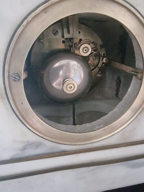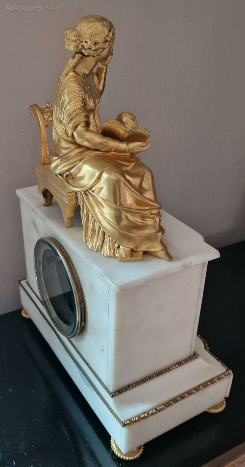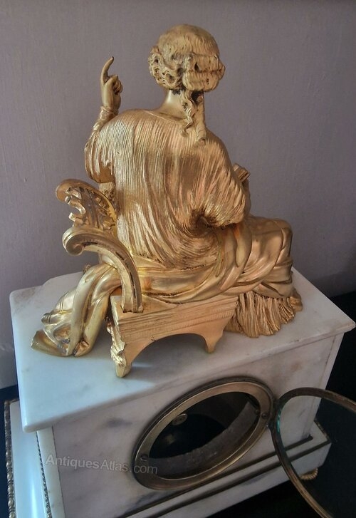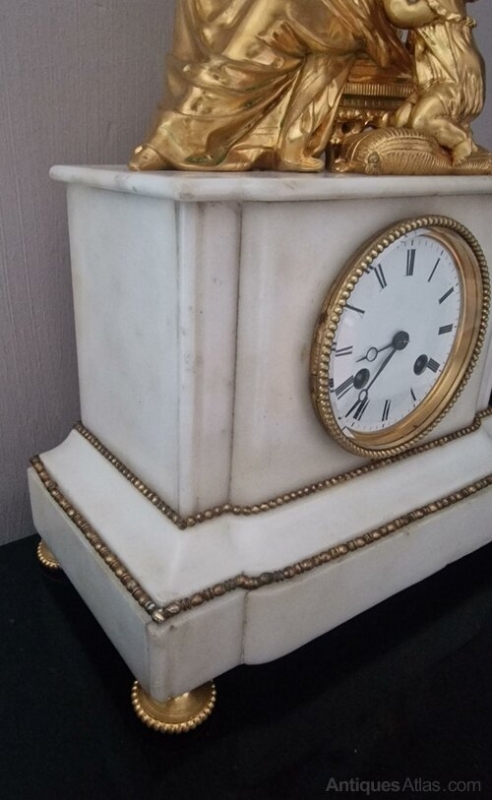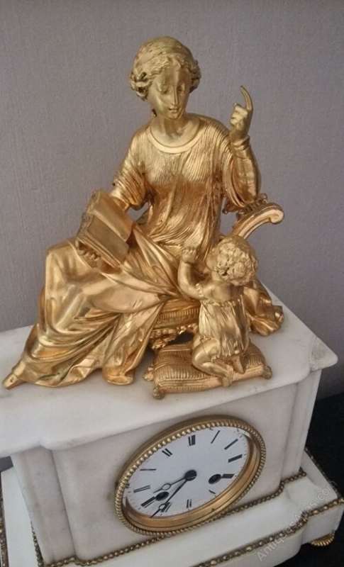 A good quality French figural mantel clock. Superb quality gilding to the seated lady and child. A white marble case with decorative gilt mouldings and gilded adjustable feet. An 8-day duration mechanism striking the 1/2 hours and hours on a bell marked Berger of Paris. A Japay Fils mark for 1849.