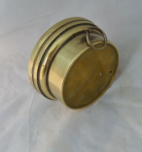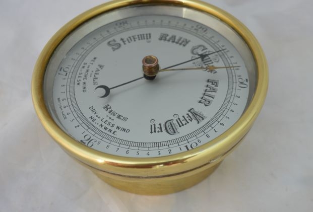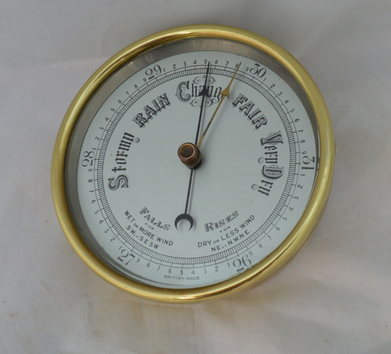 A brass cased aneroid barometer. A silvered dial with pressure marks in inches from 26 to 31. A blued steel hand and brass set point hand. Weather predictions under 'Falls and Rises'. Circa 1950.