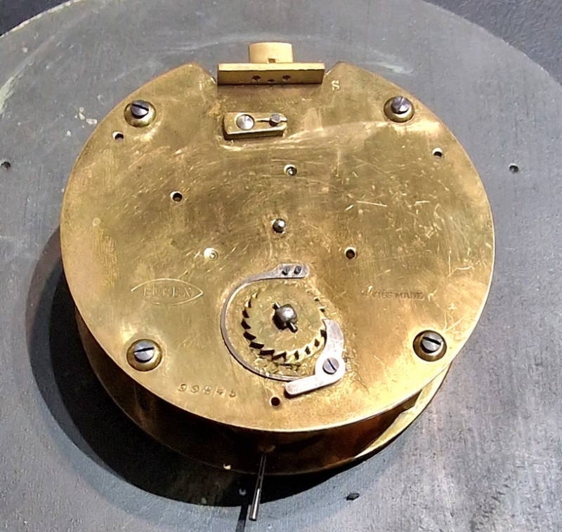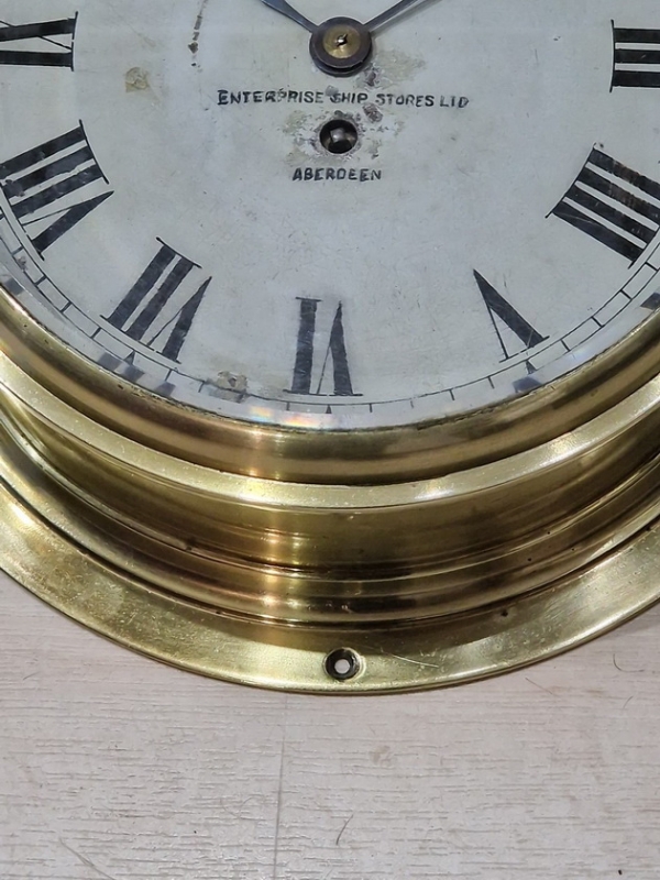 A Scottish brass ships bulkhead clock. Bevelled glass to the opening front bezel. A good quality brass case. A painted dial with a Slow/Fast regulator adjuster. Retailer 'ENTERPRISE SHIPS STORES LTD ABERDEEN' to the dial. Blued steel hands. A 7-day timepiece mechanism by Buren. Circa 1930.