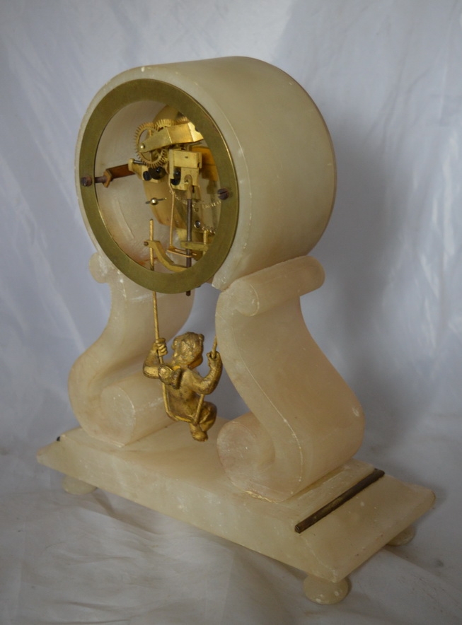 A French 'swinging cherub' mantel clock. An alabaster case with a circular top and shaped sides with brass decorations. A circular enamel dial with a skelotonised dial centre. A 7-day duration timepiece mechanism by Farcot of Paris. Circa 1875