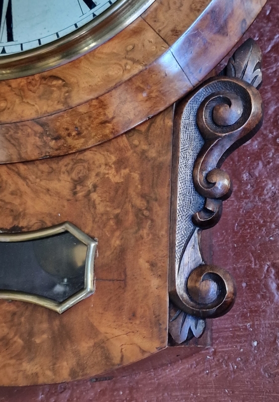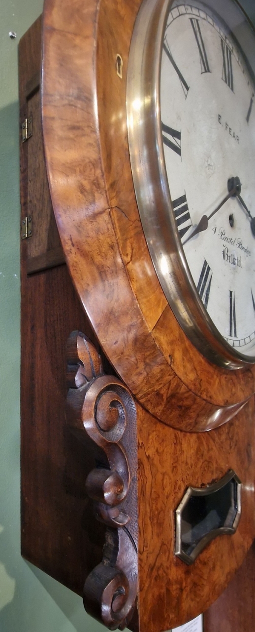 A Victorian fusee drop dial wall clock. A 12" painted dial signed 'E FEAR 4, BRISTOL BRIDGE, BRISTOL'' with blued steel hands. A lovely quality burr walnut case with choice veneers. A brass bezel surround. The original side carvings to the base with a brass edged pendulum window.
