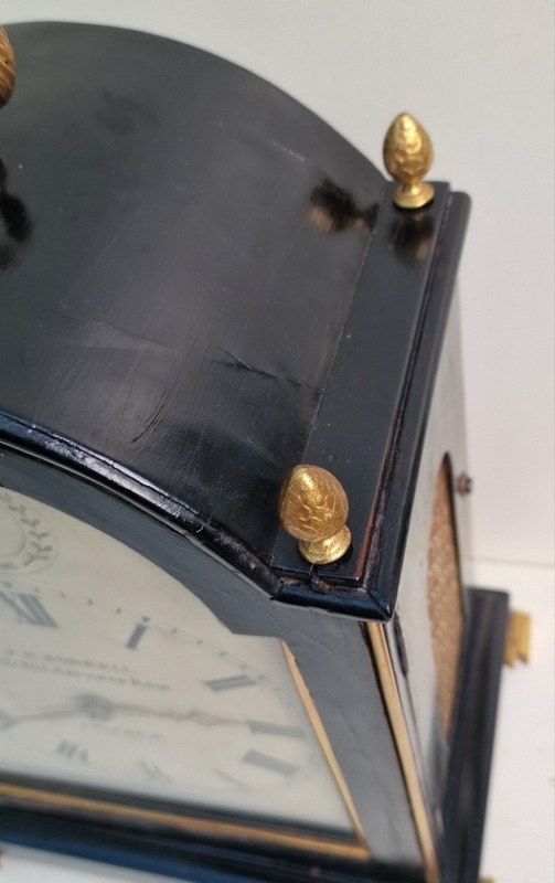 A London, ebonised bracket/table clock of good proportions. The case front has gilded brass edging to the dial and standing on gilded ogee feet. Brass fretwork to the case sides with silk backing. Gilded brass edging to the case sides. An arched painted dial signed 'J H Borrell 15 Wilderness Row, London' with a strike/silent to the arch. Lovely engraved hands. A fine quality, twin fusee mechanism striking the 1/2 hours and hours on a bell. A beautifully engraved backplate to the mechanism signed 'J H Borrell, London' within a cartouche. A glass back door showing the mechanism. Circa 1835.