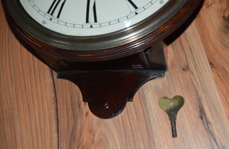 A rarer Georgian 'salt box' fusee wall clock. A mahogany case with a narrow dial surround and a concave cast brass bezel. A 'salt box' curved base found on these early examples. A convex 12" painted dial with blued steel hands signed 'Jams. Delasalle, Gosport'. An 8-day duration timepiece fusee mechanism with tapered plates. A period winding key, Circa 1820.
