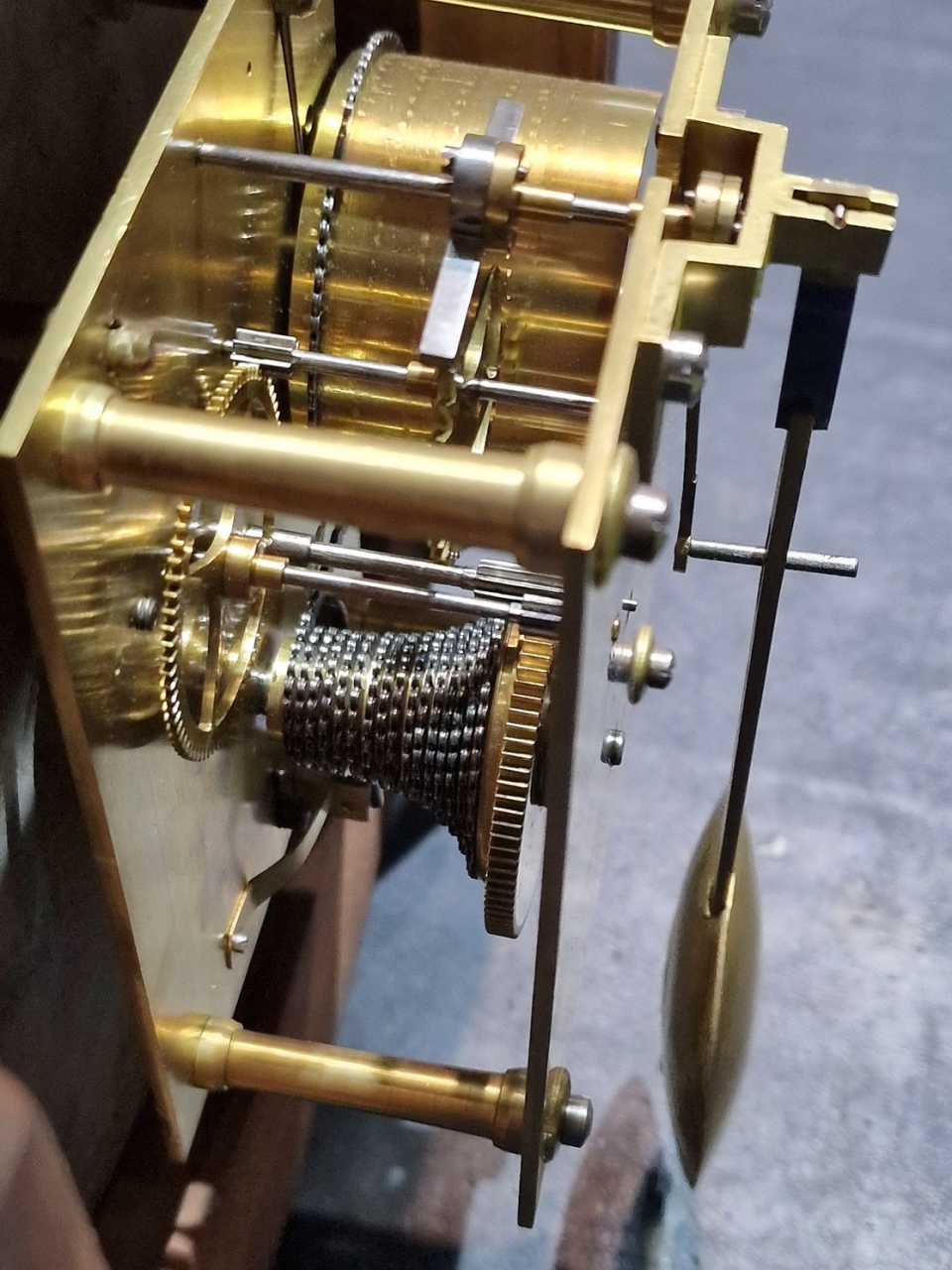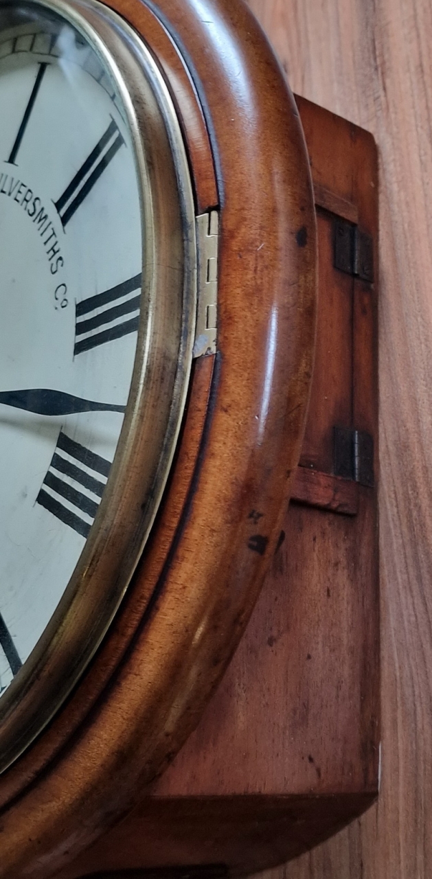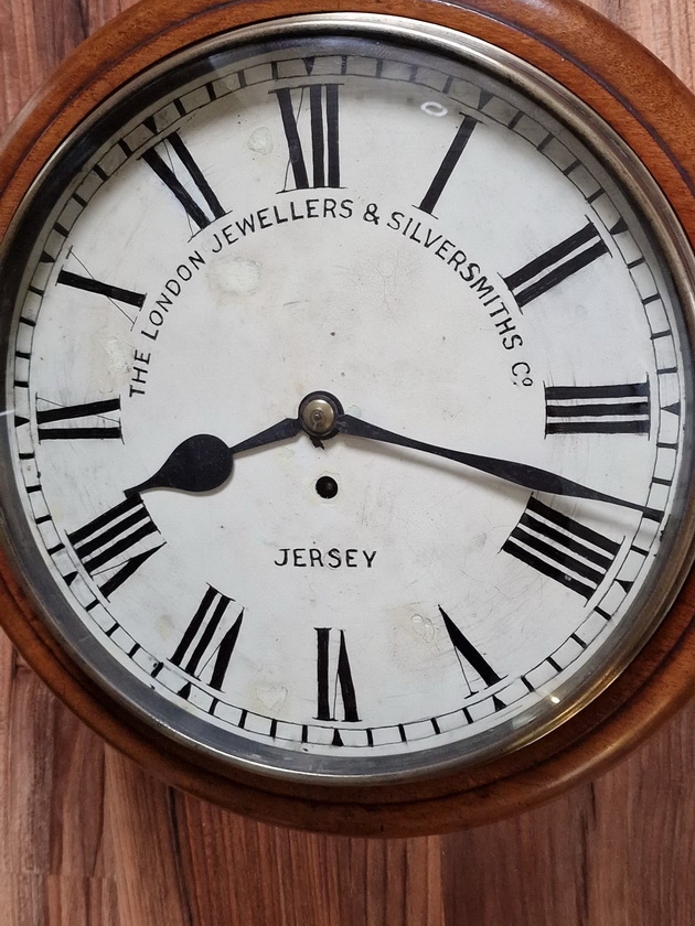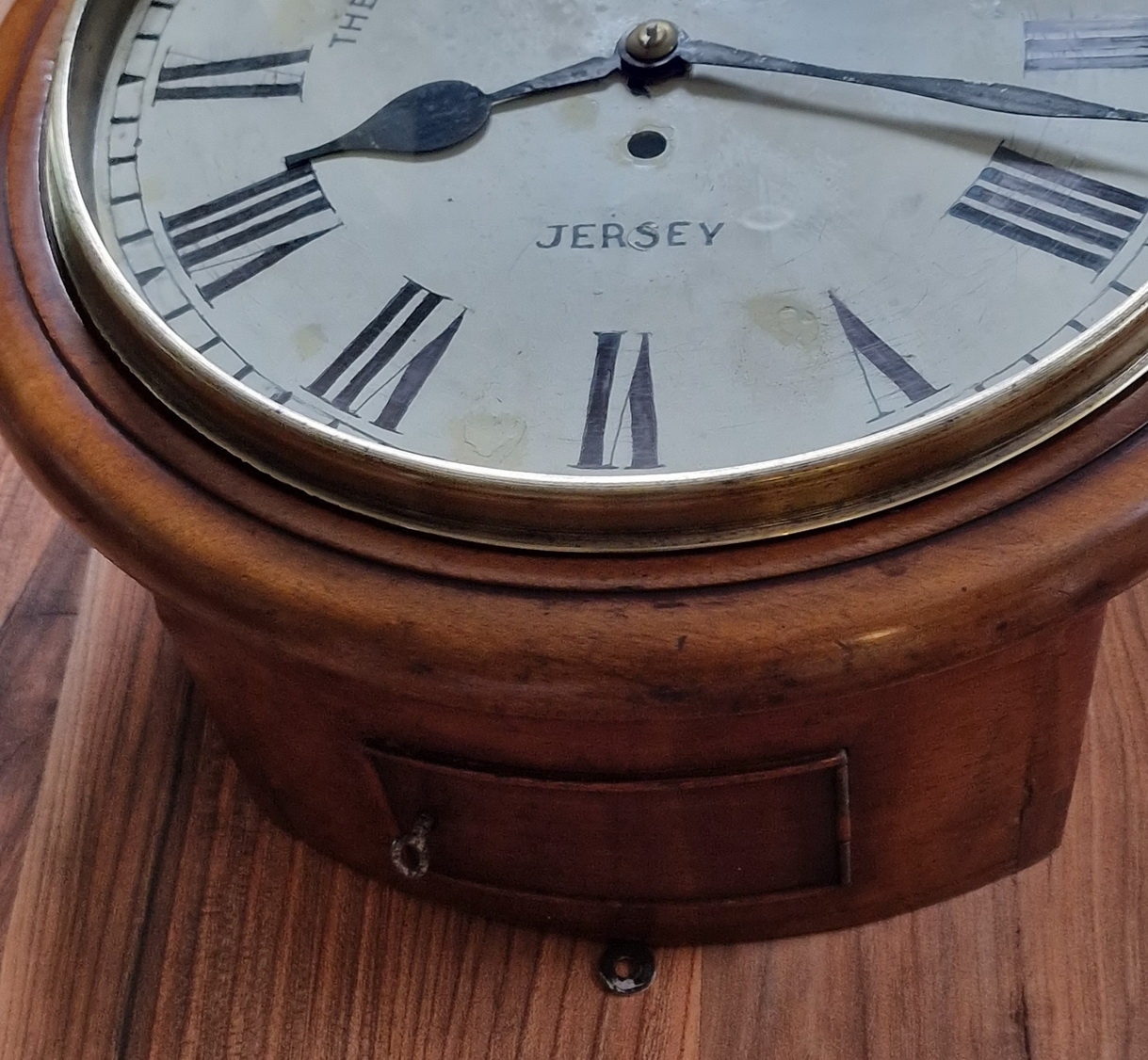 A late Victorian fusee dial wall clock. A 12" painted dial signed 'THE LONDON JEWELLERS & SILVERSMITHS Co. JERSEY' with blued steel hands. A mahogany case case of light colour with a brass bezel surround and convex glass. An 8-day duration fusee timepiece mechanism. Circa 1890.