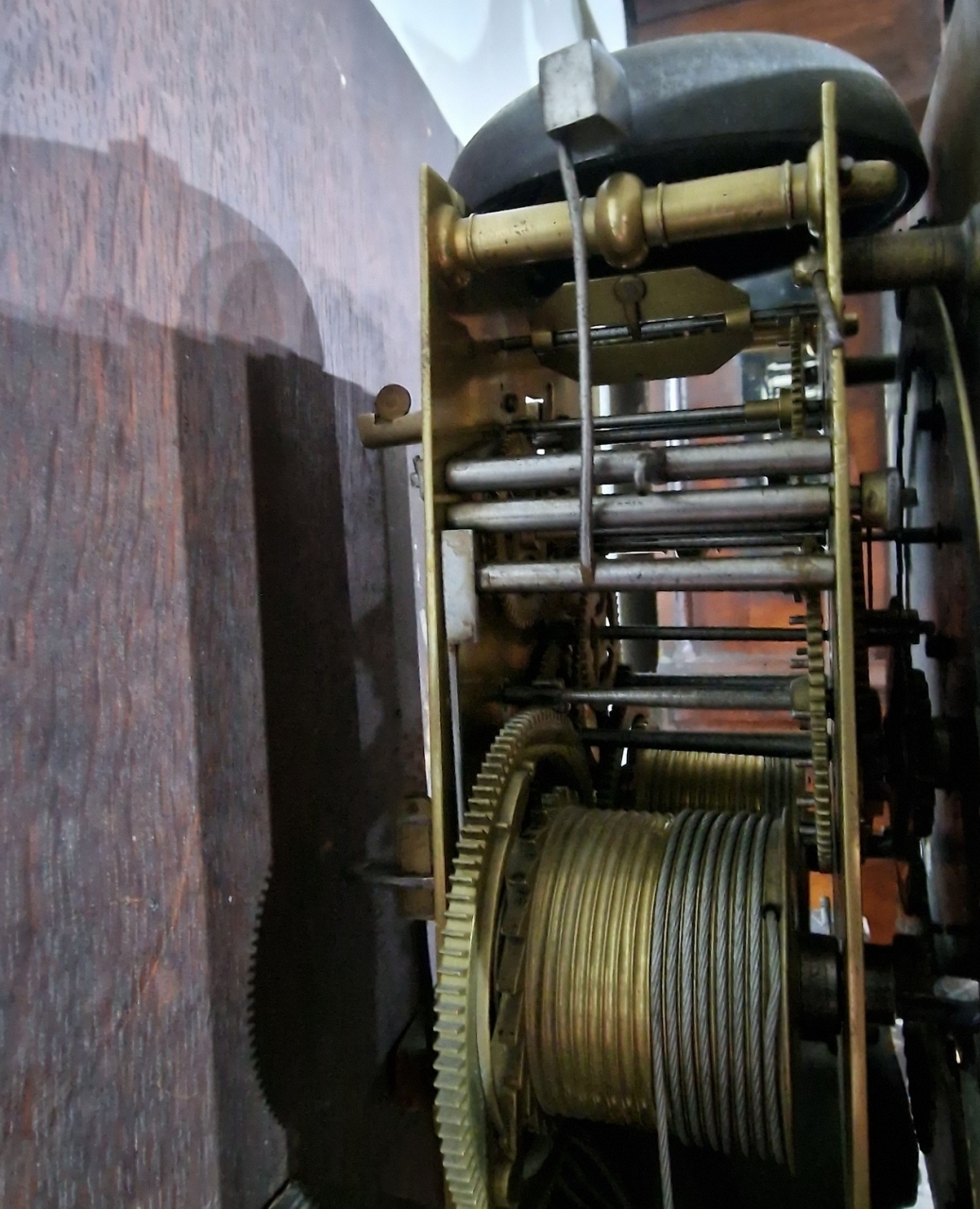 A 10" brass and silvered dial with small winged cherub corner spandrels. A silvered chapter ring engraved 'John Hudson, London'. A gilt matted dial centre with a date aperture and seconds dial. Brass cased weights. A 5 pillar, month duration mechanism striking the hours on a bell. An outside striking count wheel. Circa 1690.