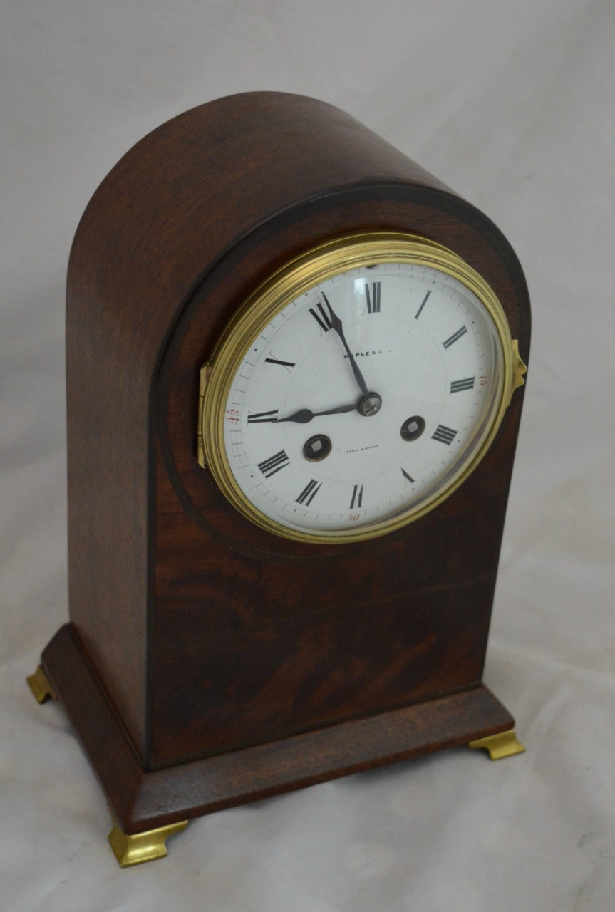 An Edwardian mahogany cased mantel clock of smaller proportions. Choice flame mahogany veneers to the rounded top case of Georgian design. Ogee brass bracket feet. An enamel dial, brass bezel and convex glass with blued steel hands. Signed to the dial by retailer 'Maple & Co. London'. An 8-day duration mechanism striking the 1/2 hours and hours on a gong. Circa 1910.