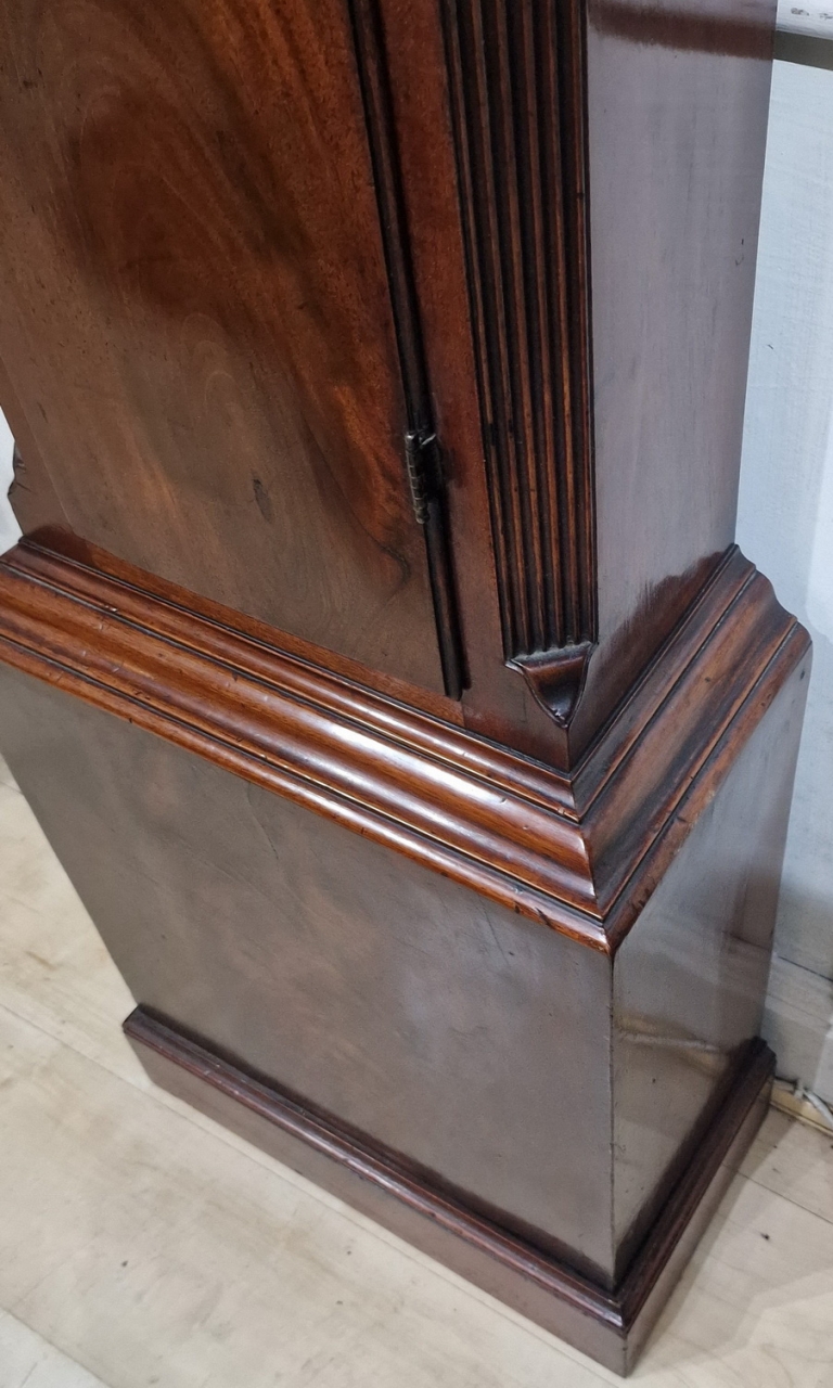 A small proportioned Georgian mahogany Somerset longcase clock. A slim case with an arched pediment and side glass hood apertures. Gilded hood front and rear column capitals. Choice flame mahogany case veneers and an arched trunk door. An arched brass and silvered dial with blued steel hands. Lunar moon phases to the arch and engraved 'Musgrave Taunton'. A seconds dial and a rarer feature of an inner date dial with a brass hand pointer. An 8-day duration mechanism striking the hours on a bell. Circa 1780.George Musgrave of Taunton is recorded in A J Moores ' 'The Clockmakers of Somerset' book as working from 1750-1795. Various examples are noted in the book.