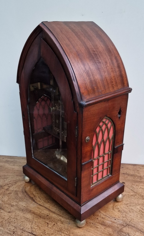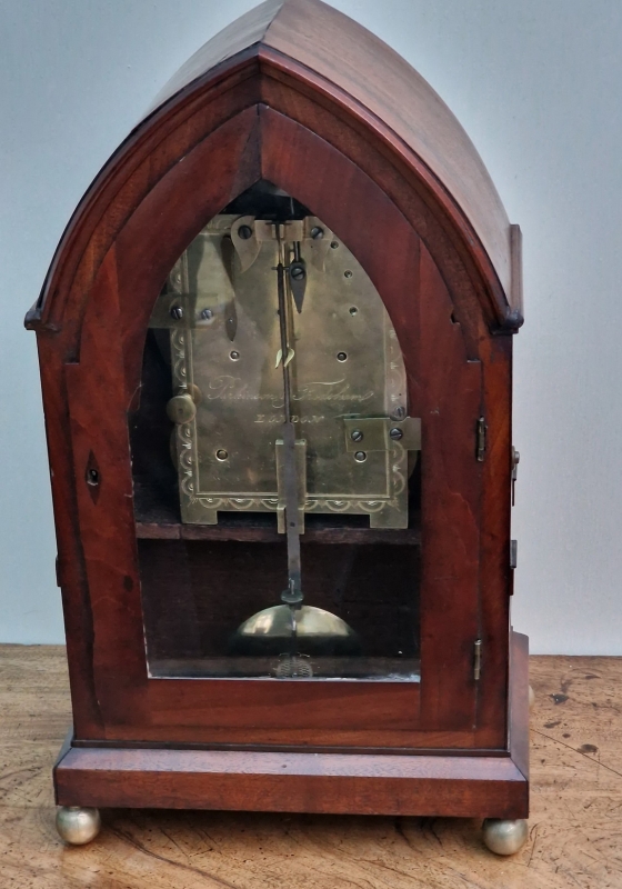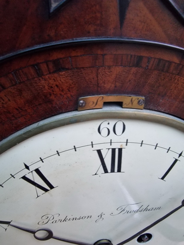 An English Georgian twin fusee bracket/table clock. An elegant lancet top mahogany case with choice flame veneers. Brass sound fretted side panels with silk backing. An engraved cast brass bezel with convex glass and standing on brass ball feet. An arched glass back door. A convex dial with blued steel hands signed 'Parkinson & Frodsham, London'. A strike/silent lever to the top of the dial. A quality double fusee mechanism striking the hours on a bell of 8-day duration. Signed 'Parkinson & Frodsham London' to the backplate and border engraving. A good quality steel and brass pendulum with engraving. A pendulum transportation lock. Circa 1820.