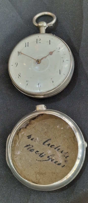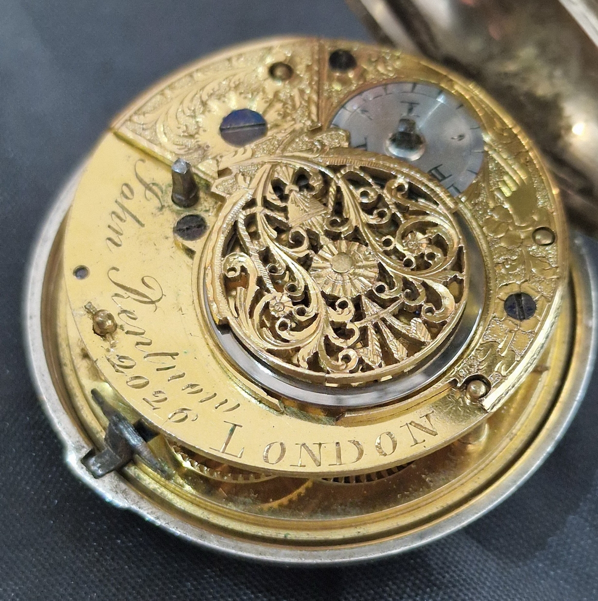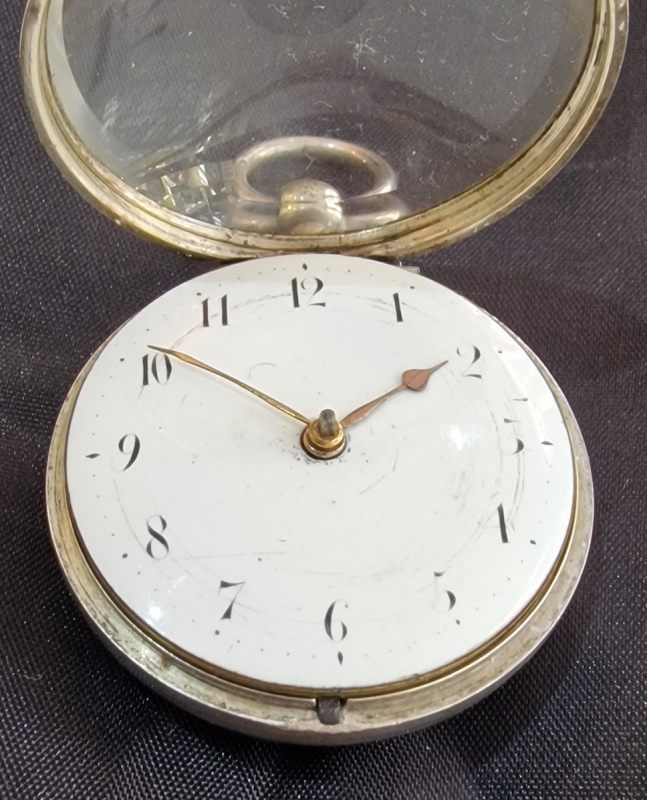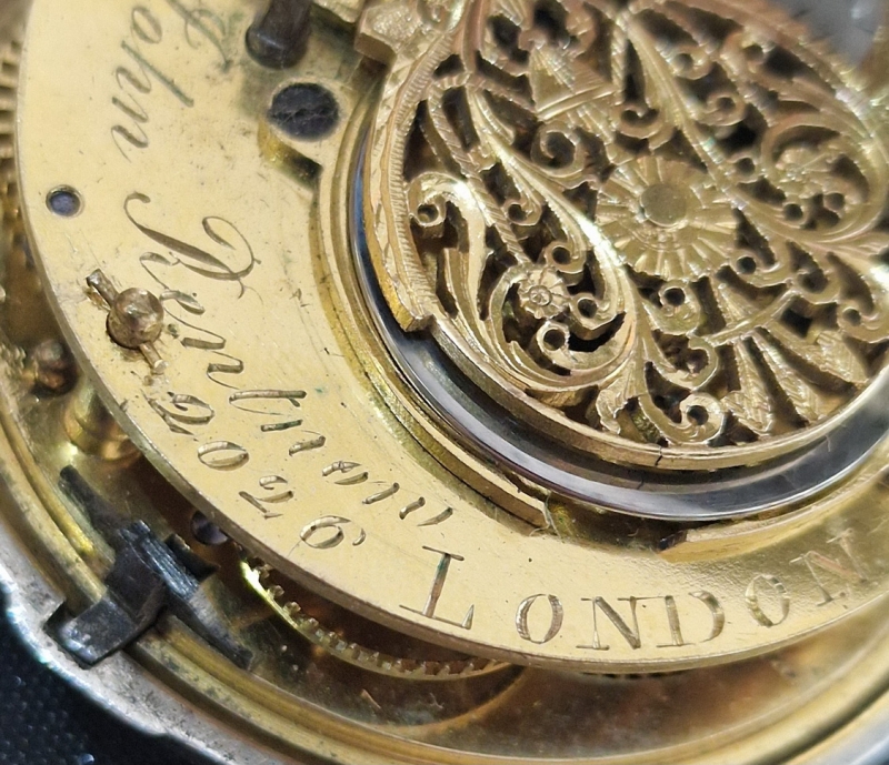 A Georgian period, London verge pocket watch. A pair case example with an inner and outer silver case. A convex enamel dial with brass hands. A 'bullseye' convex glass. A superbly detailed verge fusee mechanism with gilt plates and a pierced back cock. Signed by the maker 'John Rentnor London' and numbered 2026. A key wind mechanism. Silver London hallmarks for 1810.