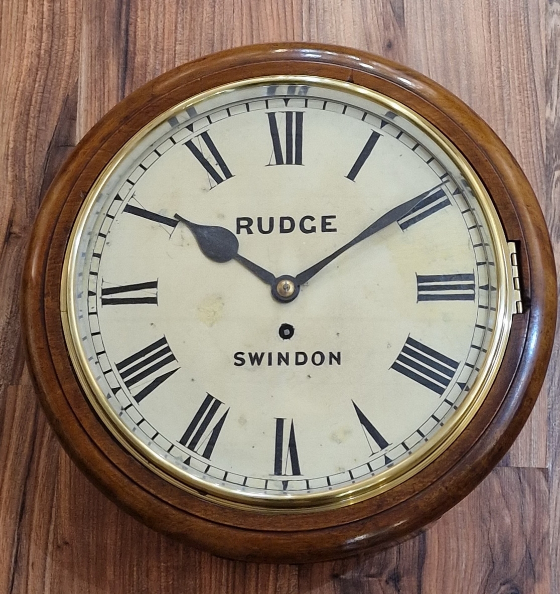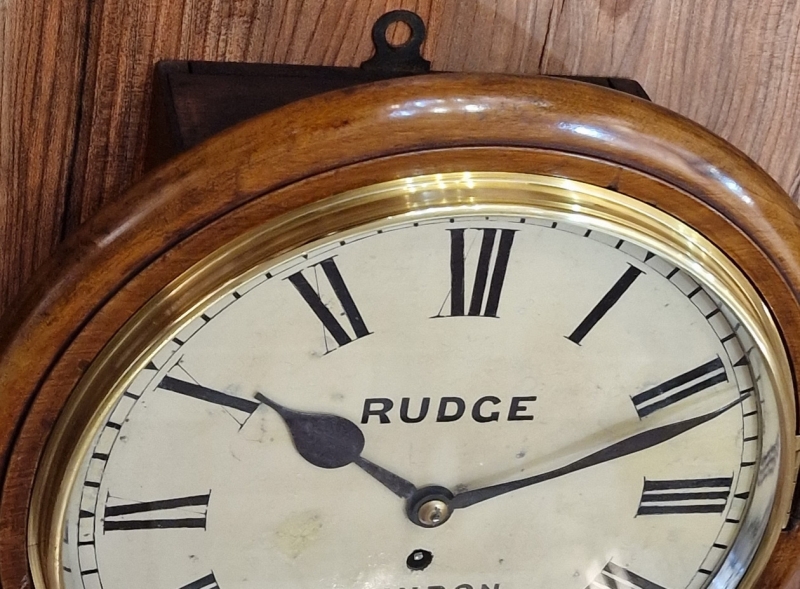 A Victorian fusee dial wall clock. A 12" painted dial signed 'RUDGE SWINDON' with blued steel hands. A light mahogany case with a brass bezel surround. An 8-day duration fusee timepiece mechanism. Circa 1890.